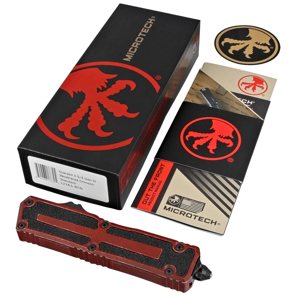 Scarab II Gen III S/E Weathered Crimson Aluminum, Crimson is the pinnacle of automatic tactical knife excellence, drawing inspiration from the original Microtech Ultratech design. Built to withstand the toughest conditions, the new Scarab II is the best choice for intensive use. Retaining the design features of its predecessor, it sets a new standard for OTF (Out The Front) technology.
