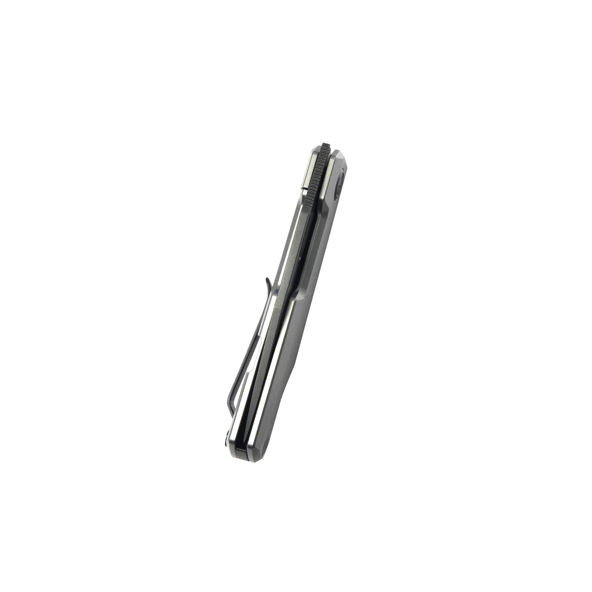 Handle - made of solid titanium 6AL4V, beveled edges of the covers eliminate sharp edges. The slightly rough texture of the handle ensures a secure grip. The entire knife is screwed onto a solid titanium backspacer. The pivot cap is made of contrasting titanium. The forefinger groove improves the grip. The single-position (right) titanium deep carry clip allows you to carry the knife discreetly in your pocket in a tip-up position (with the tip of the blade up). There is a hole in the upper part of the backspacer for a safety or decorative cord.