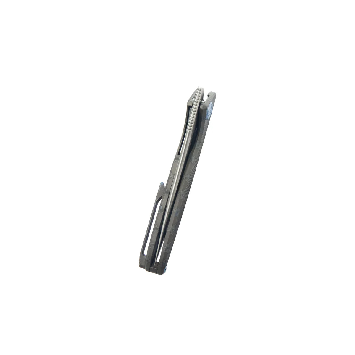 Handle - flame-finished 6AL4V titanium grips with tiger stripes, textured for a better grip. The whole is screwed to a solid backspacer, also made of titanium. The simple, solid construction guarantees many years of use. The deep forefinger groove improves the grip. The titanium deep carry clip (right side, one position) allows you to carry the knife discreetly in your pocket in tip-up position (with the tip of the blade up).