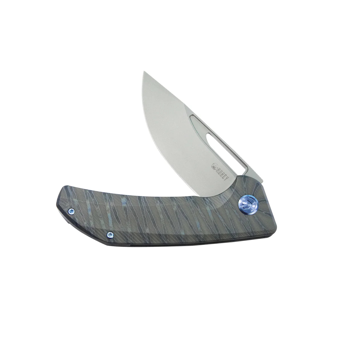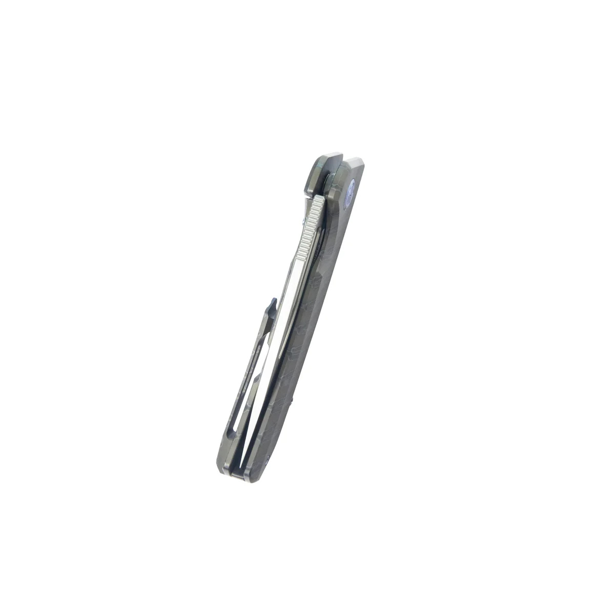 Handle - two pieces of solid titanium 6AL4V flame-colored with a Tiger Stripes pattern. The milled lines on the surface improve grip and add aesthetic charm. The beveled edges of the covers eliminate sharp edges for comfort and improve grip. The massive titanium backspacer to which the grips are attached guarantees the rigidity and strength of the entire construction. The simple, solid design guarantees many years of use. A deep forefinger groove improves grip. The pivot point is adorned with a stylized Kubey Knife logo. The single-position (right) titanium deep carry clip allows you to carry the knife discreetly in your pocket in a tip-up position (with the tip of the blade up).