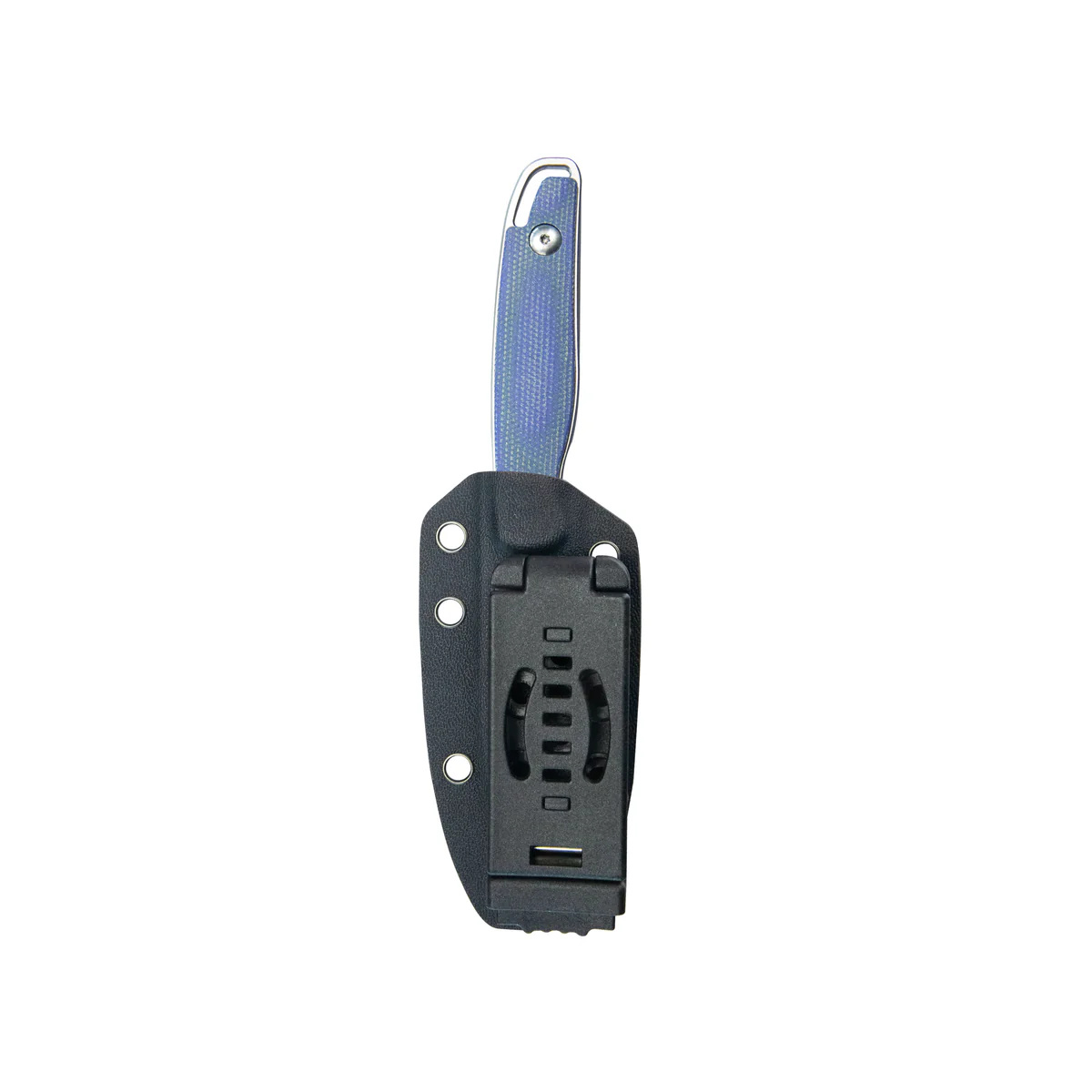 • Dust Devil Blue Micarta, bead-blasted compact fixed-blade knife with full tang design by K.C. Spiron. Blade made of vacuum-hardened and ice-hardened Sandvik 14C28N steel, grips made of Micarta composite. Includes Kydex sheath with fastener.