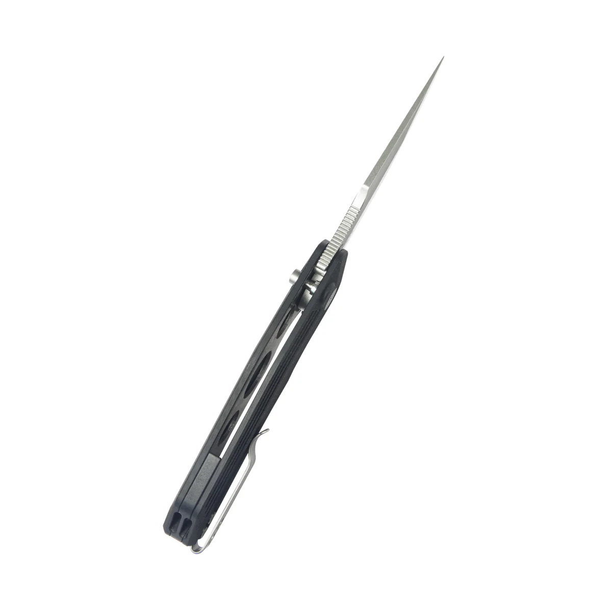 Handle - G10 composite grips, a material with exceptional mechanical strength and virtually complete resistance to weather conditions and chemicals, textured for a better grip, bolted to the knife's steel frame. A solid backspacer ensures the desired rigidity. The simple, solid design guarantees many years of use. The pivot point is adorned with a stylized manufacturer's logo. The two-position (right/left) metal deep carry clip allows the knife to be carried discreetly in the pocket in a tip-up position (with the tip of the blade up). There is a space in the backspacer for attaching a safety or decorative cord.