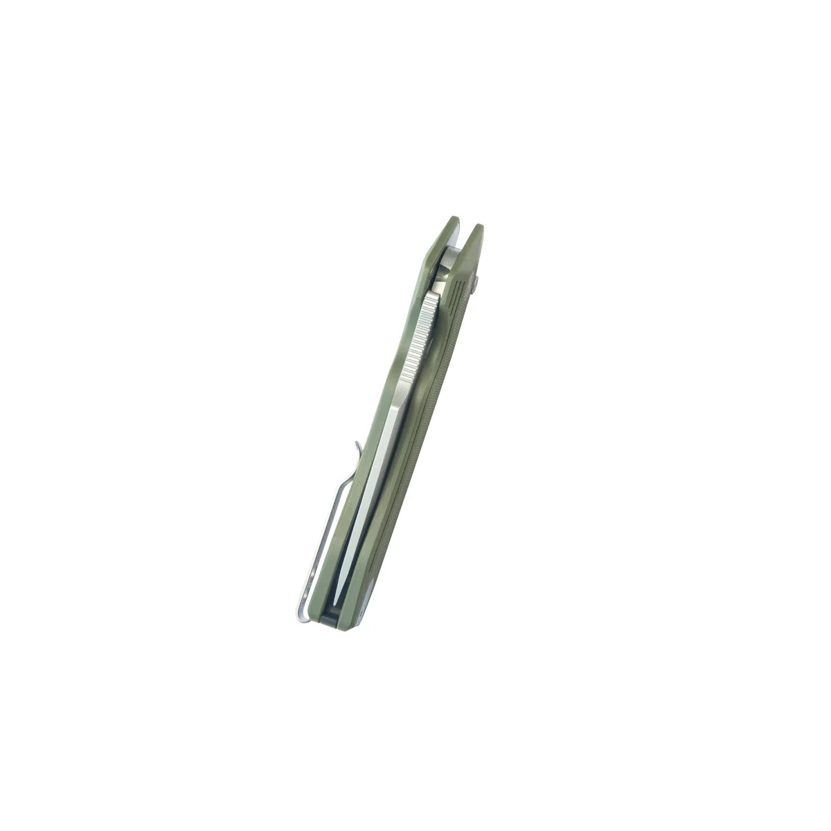 Handle - grips made of G10 composite, a material with extremely high mechanical strength and virtually complete resistance to weather conditions and chemicals, textured for improved grip, bolted to the knife's steel frame. A massive backspacer ensures the desired rigidity. The simple, solid design guarantees many years of use. The pivot point is adorned with the manufacturer's stylized logo. The two-position (right/left) metal deep carry clip allows the knife to be carried discreetly in the pocket in a tip-up position (with the tip of the blade up). There is space in the backspacer recess for attaching a safety or decorative cord.