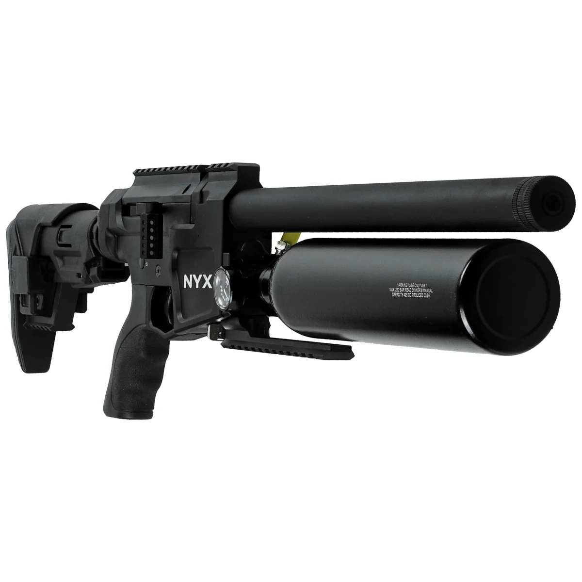 Reximex NYX Compact is a modern, compact PCP air rifle featuring a practical tactical stock with a pistol grip. Thanks to its telescopic AR-style buttstock and adjustable cheek rest, the rifle can be fully customized to the shooter's preference. A large-capacity 425cc air cylinder caters to fans of extended shooting sessions without worrying about frequent refills. The rifle is outfitted with a precision rifled barrel with an integrated suppressor, a pressure regulator, a biathlon-style side lever action, a 22 mm optics rail, and a match-grade trigger with an adjustable pull weight. Available calibers include: .177 (4.5 mm), .22 (5.5 mm), and .25 (6.35 mm).