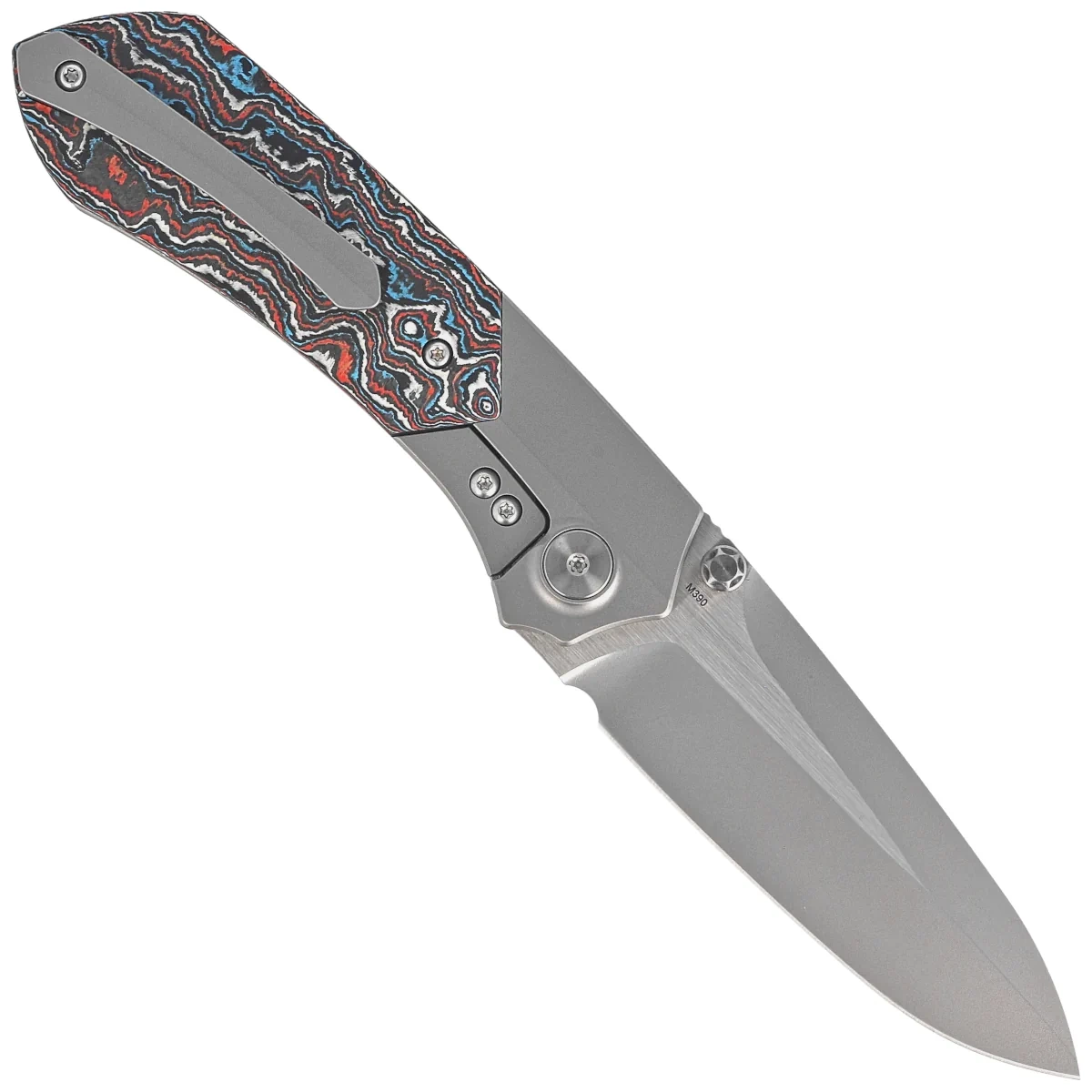 Handle - 6AL4V titanium bolsters, Nebula Carbon Fiber composite handle made of virtually indestructible material, resistant to weather conditions, chemicals and mechanical damage. The beveled edges of the covers eliminate sharp edges. The grips are screwed to a solid titanium backspacer, ensuring that the desired stiffness of the entire structure is maintained. On the left side, there is a wide Button Lock button, placed in a recess to avoid accidental opening. The The single-position (right) titanium deep carry clip allows you to carry the knife discreetly in your pocket in a tip-up position (with the tip of the blade up).