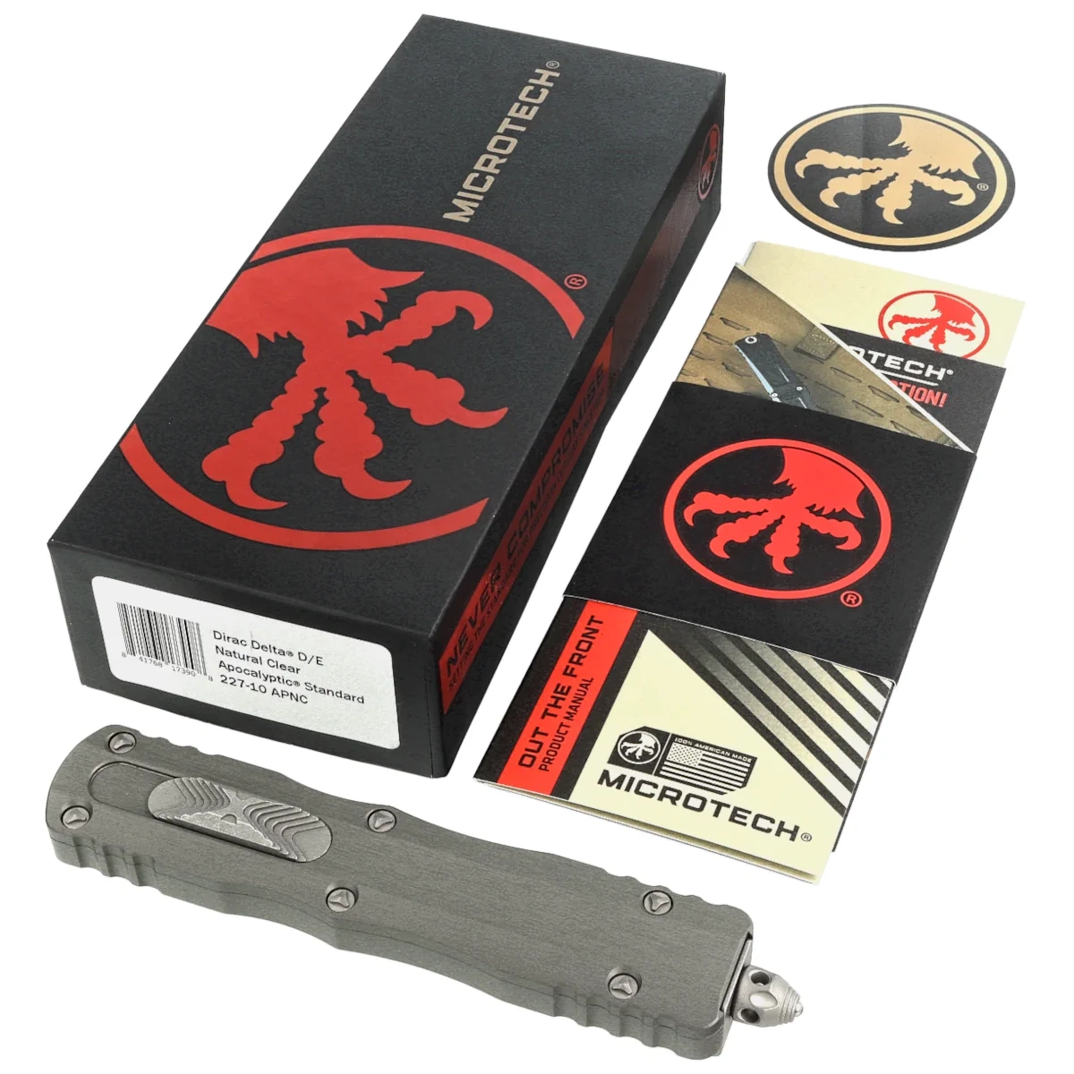 Microtech Dirac Delta D/E OTF Knife Natural Clear Aluminum, Apocalyptic M390 by Tony Marfione (227-10APNC)