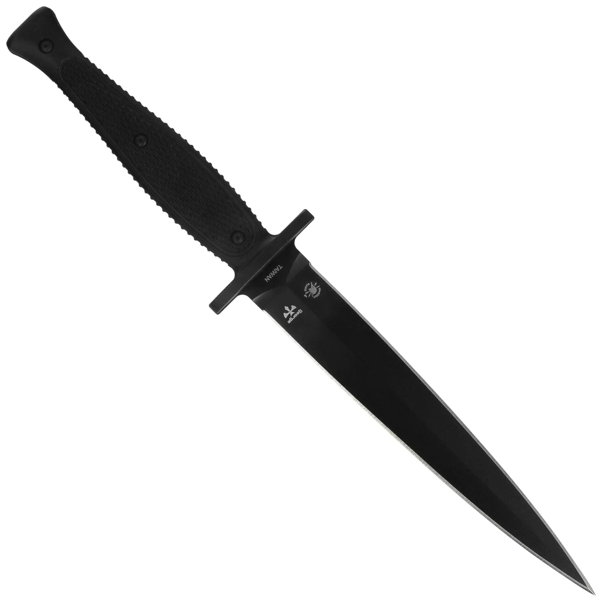 Blade - classic Dagger profile, D/E (Double Edge) sharpened on both sides, covered with black powder coating. The blade thickness in combination with the symmetrical flat grind provides excellent cutting properties combined with high durability. The guard on both sides protects the hand from sliding onto the blade.