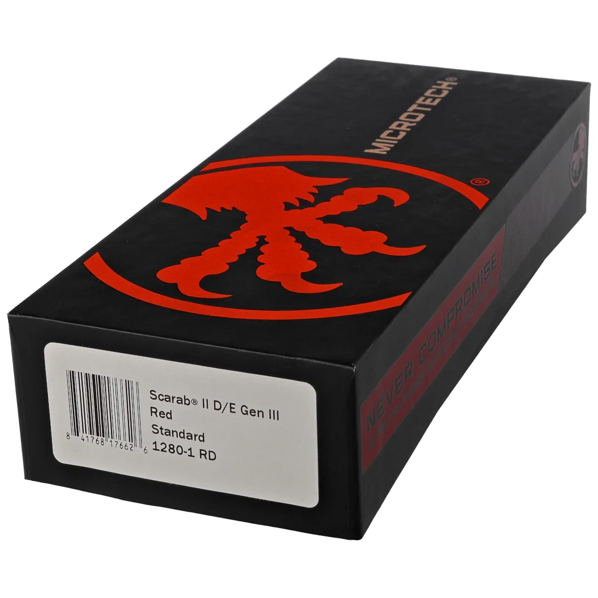Scarab II Gen III D/E Red Aluminum/3M, Black is the pinnacle of excellence in automatic tactical knives, taking inspiration from the original Microtech Ultratech design . Built to withstand the toughest conditions, the new Scarab II is the ultimate choice for heavy use. While retaining the styling features of its predecessor, it sets a new standard for OTF (Out The Front) technology.