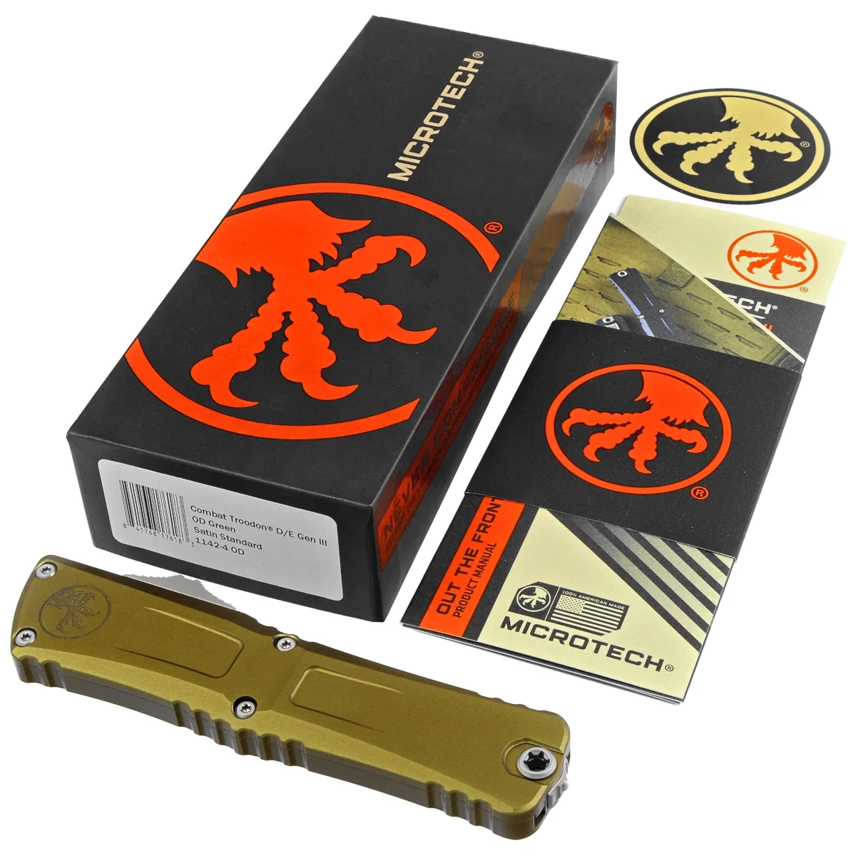 Combat Troodon Gen III D/E OD Green Aluminum, Satin the largest of the automatic knives, is the pinnacle of precision engineering and tactical efficiency in the field of OTF (Out The Front) knives. Built for a wide range of uses, it is 25% larger than the flagship Troodon. Precision-crafted, equipped with a sophisticated and extremely fast retractable mechanism and a razor-sharp blade. 100% made and assembled in the USA. Designed by Anthony Marfione, knifemaker and owner of Microtech Knives.