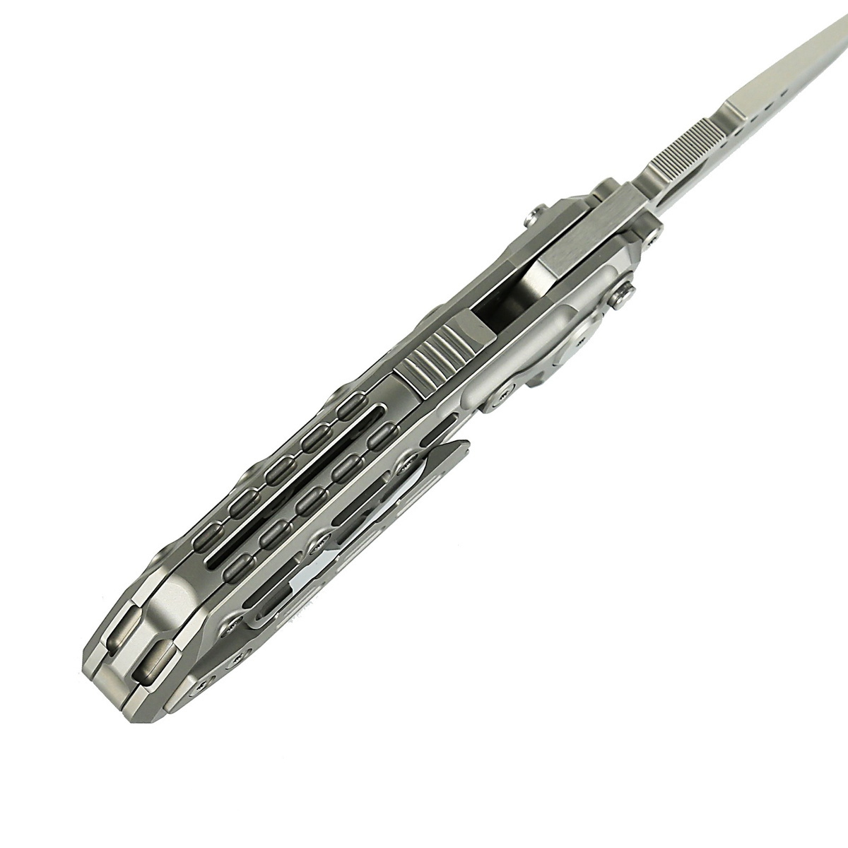 Handle - made of solid titanium 6AL4V, perfectly milled on CNC machines. The contouring of the covers eliminates sharp edges, and the openwork surface improves grip. Only a few companies are able to make a handle with such incredible accuracy! The grips are connected by a titanium backspacer. A single position titanium clip (right) allows the knife to be carried in a tip-up position. On the spine, a slider releases an additional lock in the form of two steel rollers located above the pivot axis. The lock also works when the knife is closed, preventing accidental opening. The protruding part of the backspacer can be used as an improvised ice pick, it also has a hole for a safety or decorative cord.