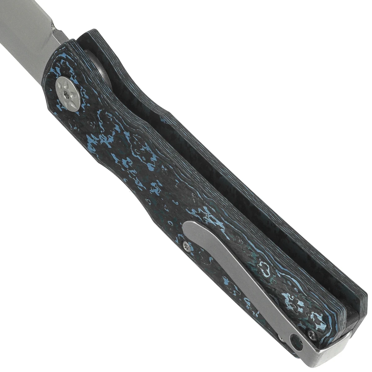 Handle - grips made of Fat Carbon composite, a material of exceptional strength and unique aesthetics. The backspacer is an integral part of the W-Lock locking system, increasing the rigidity and stability of the construction. The decorative pivot contrasts effectively with the color of the grips, adding elegance to the whole. The ergonomic fore finger groove at the front of the handle improves grip and creates a guard to prevent the hand from accidentally slipping onto the blade. The one-position, right-handed clip allows the knife to be carried discreetly in the pocket in a tip-up position (with the tip of the blade facing upwards).