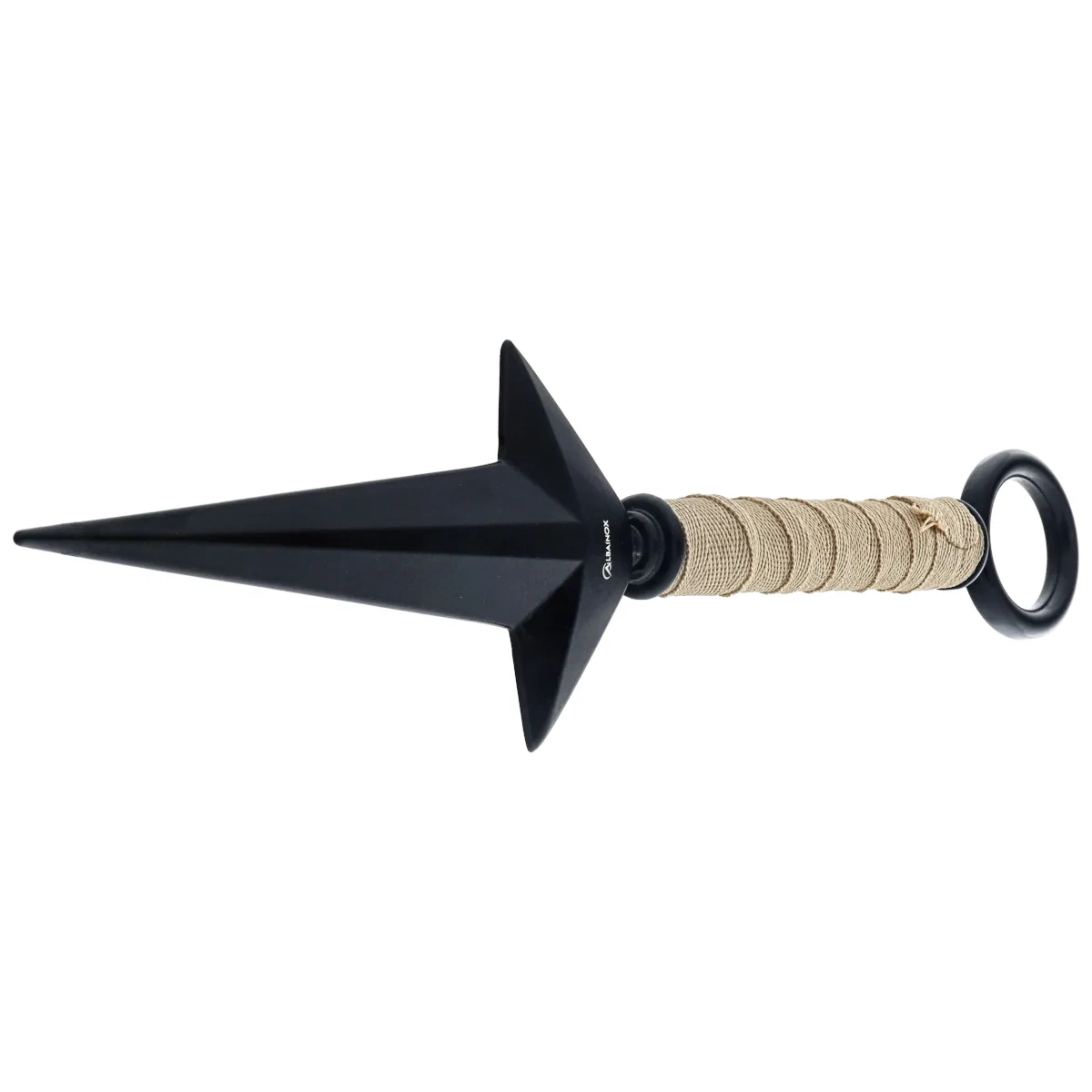 - 32679 Coyote Cord, Black Zamak – a training kunai knife made of black zamak, with a handle wrapped in coyote-colored cord. Symmetrical, safe design for learning combat techniques and martial arts demonstrations.