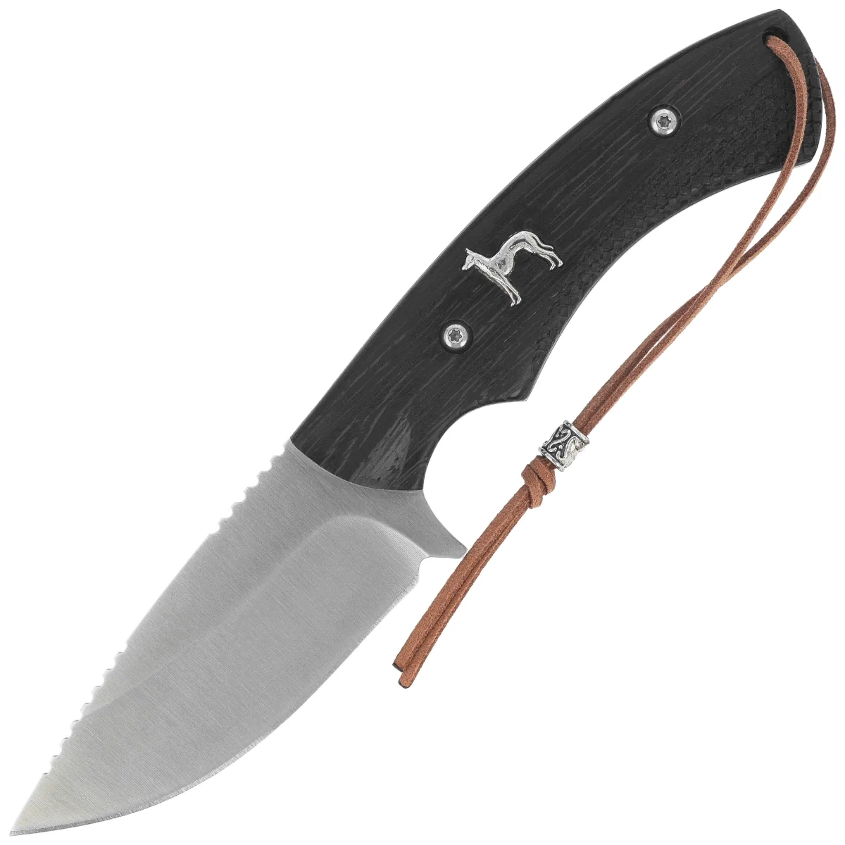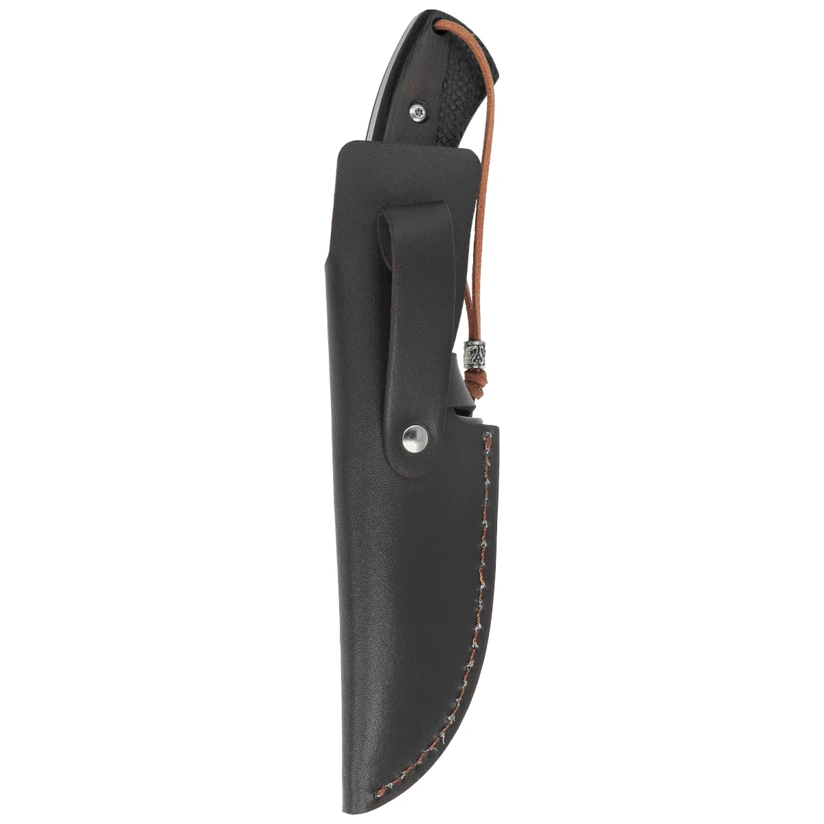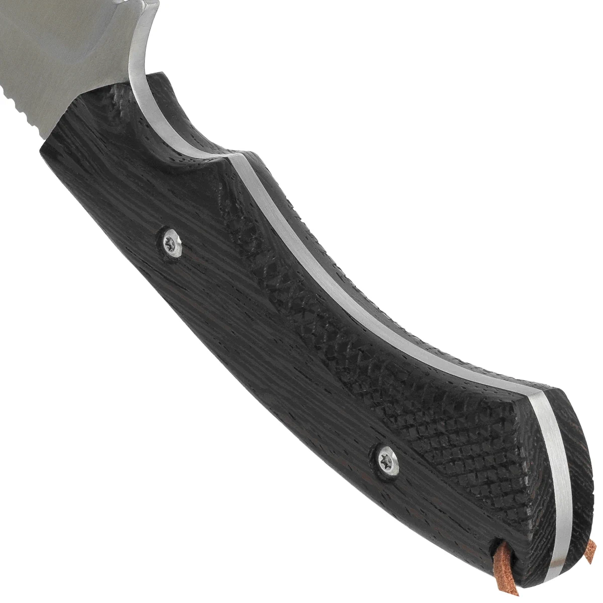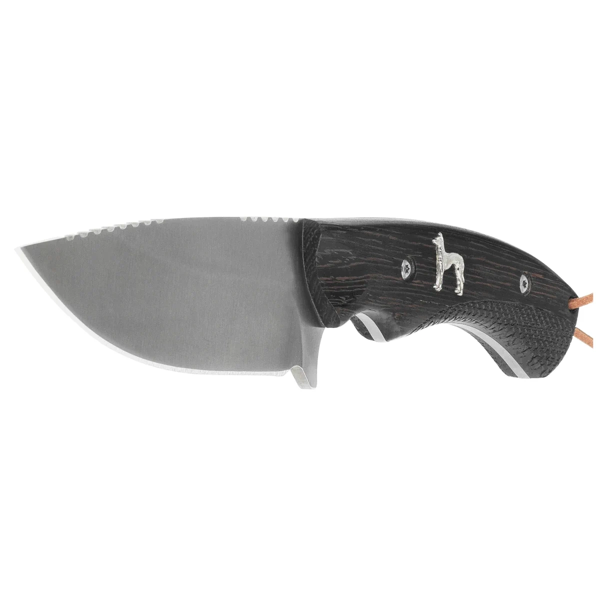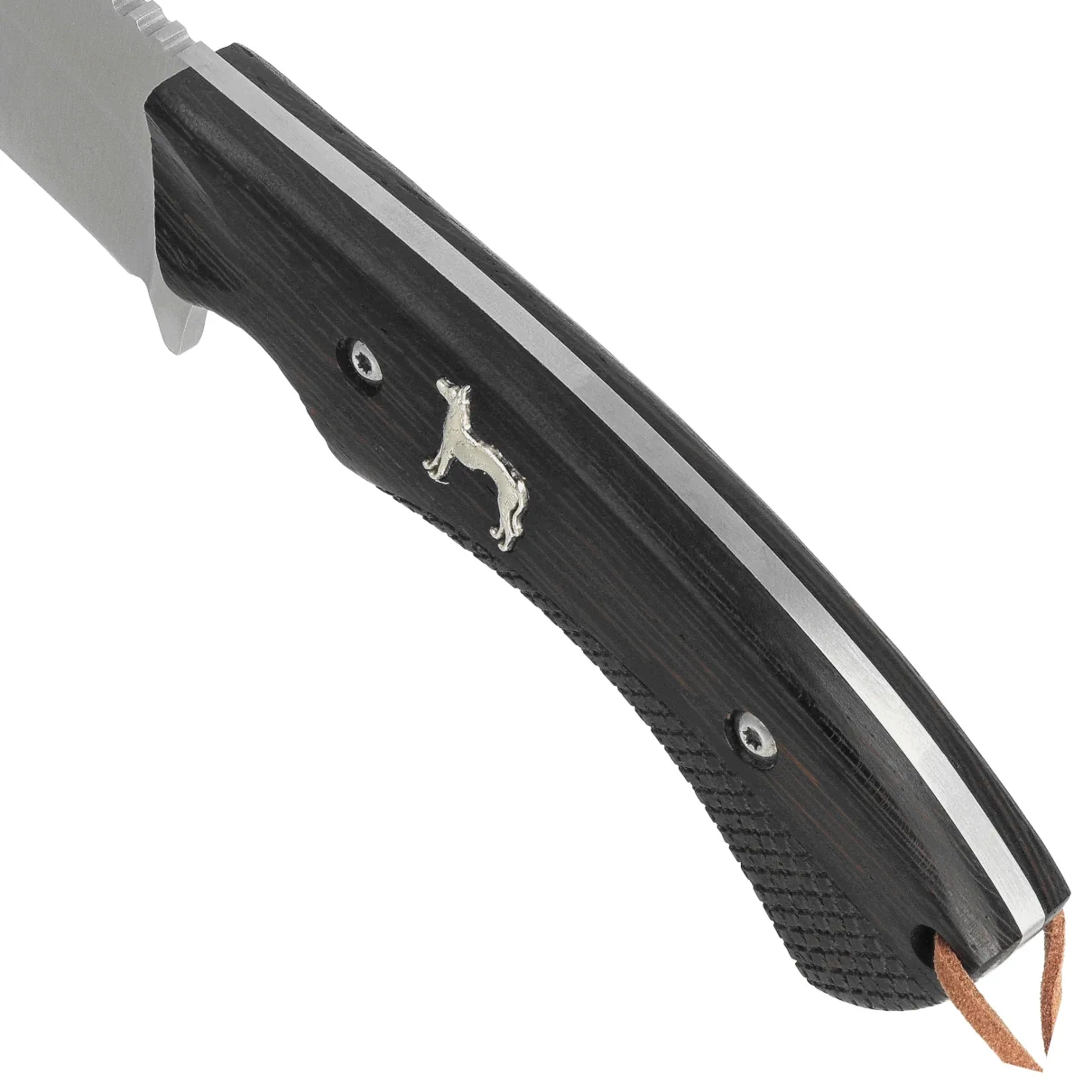 Handle - made of zebrawood, known for its abrasion and moisture resistance and striking, striped grain pattern. Ergonomic curves and finger undercuts improve control and grip confidence in any working position - whether with dry hands, wet hands or wearing gloves. The grips are permanently attached to the shank with steel rivets, which strengthens the structure and prevents play. Decorative engraving with a silhouette of a galgo dog adds to the model's individual character and emphasizes its cultural references. The whole is complemented by a leather sheath with a belt attachment, which allows you to carry the knife safely and comfortably on any expedition. This is a handle designed for practical use in the field - sturdy, comfortable and aesthetically pleasing.