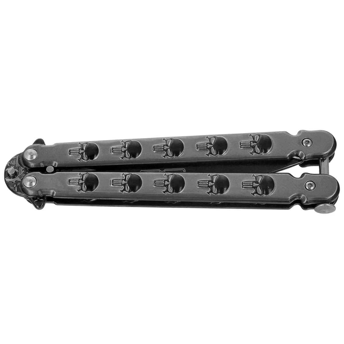 • Rainblack Skull Gray Steel, Black - decorative balisong butterfly knife from Martinez Albainox, made entirely of blackened stainless steel. The skull motif, symmetrical form and black finish make it a model of distinctive character.