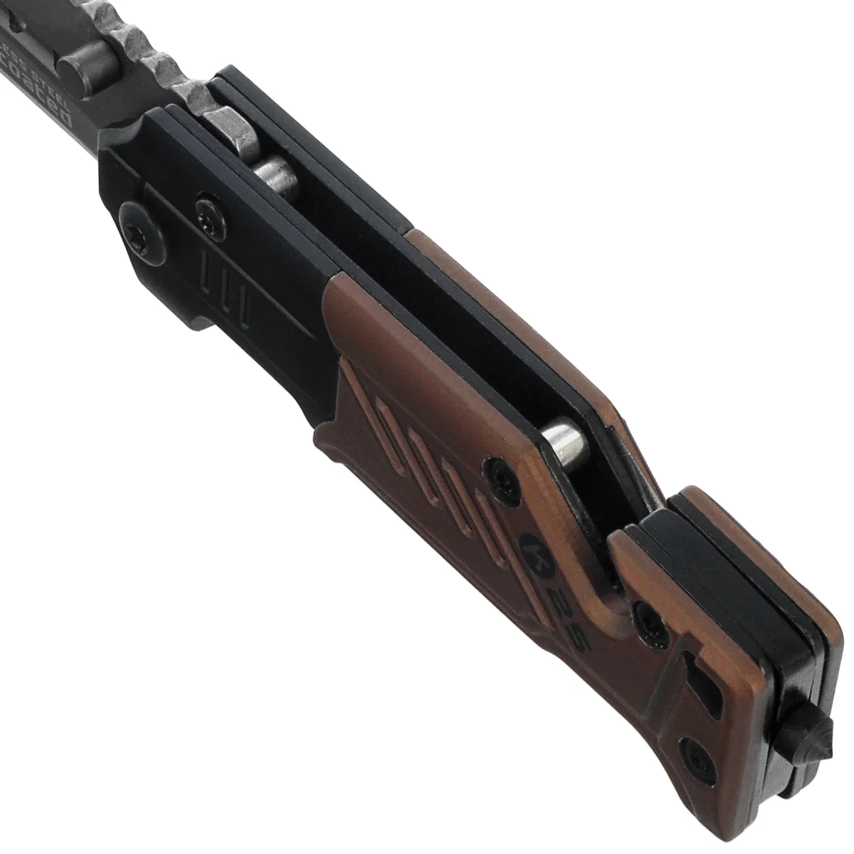 Handle - made of anodized aluminum in coyote color , which guarantees low weight and resistance to wear. Rubberized surface improves grip in the hand, even in the presence of moisture or dirt. Ergonomic profiling provides comfort and control during handling, while rescue functions - a glass breaker and belt cutter - increase the knife's range of uses in emergency situations. Thanks to its compactness, the RK-19652 model is ideal for carrying around the neck or clipping into tactical equipment. It comes with a rigid Kydex plastic sheath with a ball chain, allowing you to carry the tool safely and discreetly. This is a versatile folder for users expecting reliability in a minimalist format.