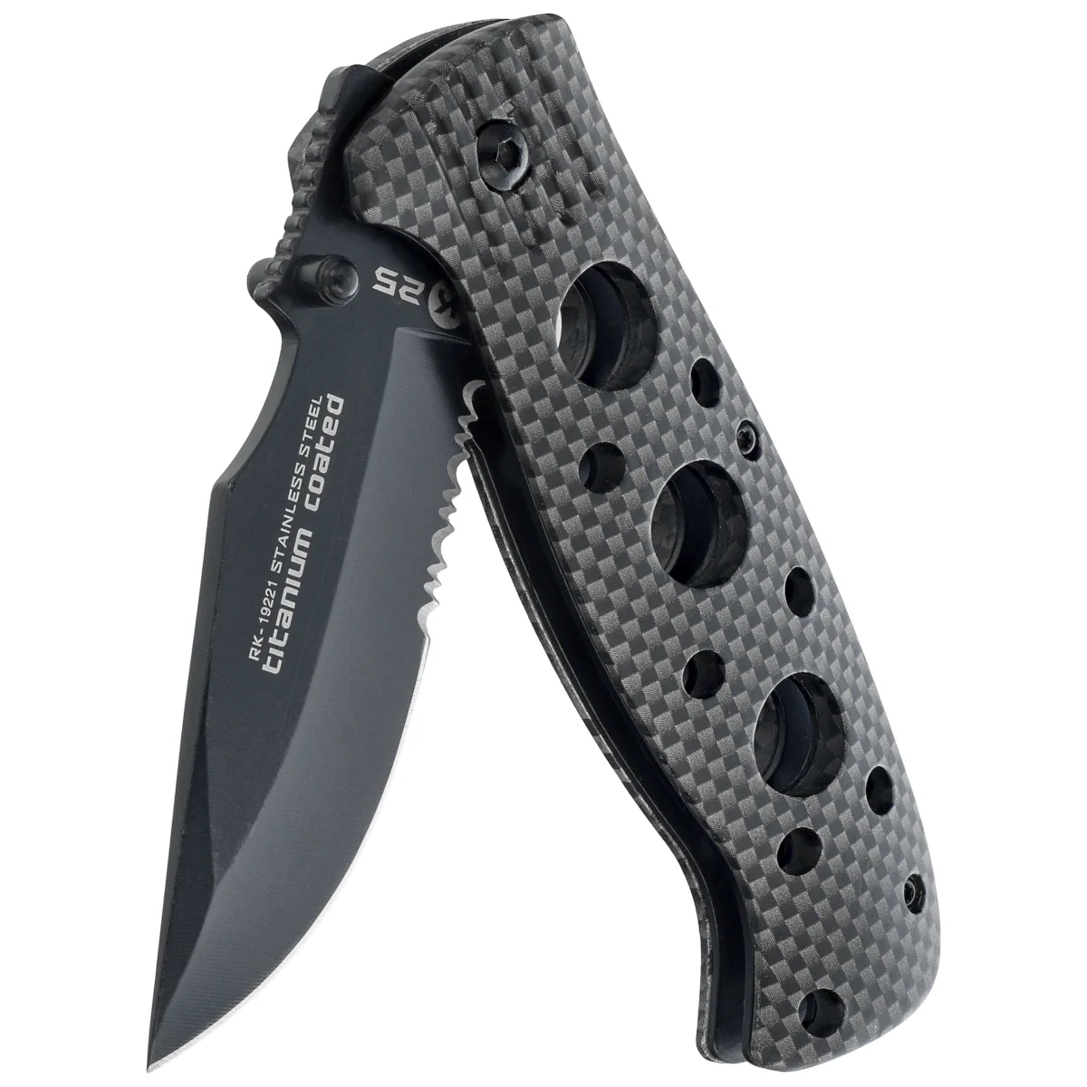 The RK-19221 is a folding EDC tactical knife designed for users looking for a lightweight, reliable tool for everyday use in the field and in urban settings. The K25 brand design combines compact form with functionality, offering a blade made of 7Cr17MoV stainless steel, known for its corrosion resistance and ease of sharpening. The black titanium coating used reduces light reflections and increases abrasion resistance, giving the blade a tactical feel. Blade with drop point profile allows precise handling and efficient cutting of a variety of materials. The design is based on a liner lock mechanism , which provides a secure lock in the open position. Handle made of anodized aluminum with rubberized coating provides comfort and grip in all conditions - from moisture to working with gloves. The model is equipped with a belt clip, a cord hole and an attached nylon sheath , which allows for a variety of carrying options. The RK-19221 is a tool for those who appreciate durability, compactness and practical design with utility.