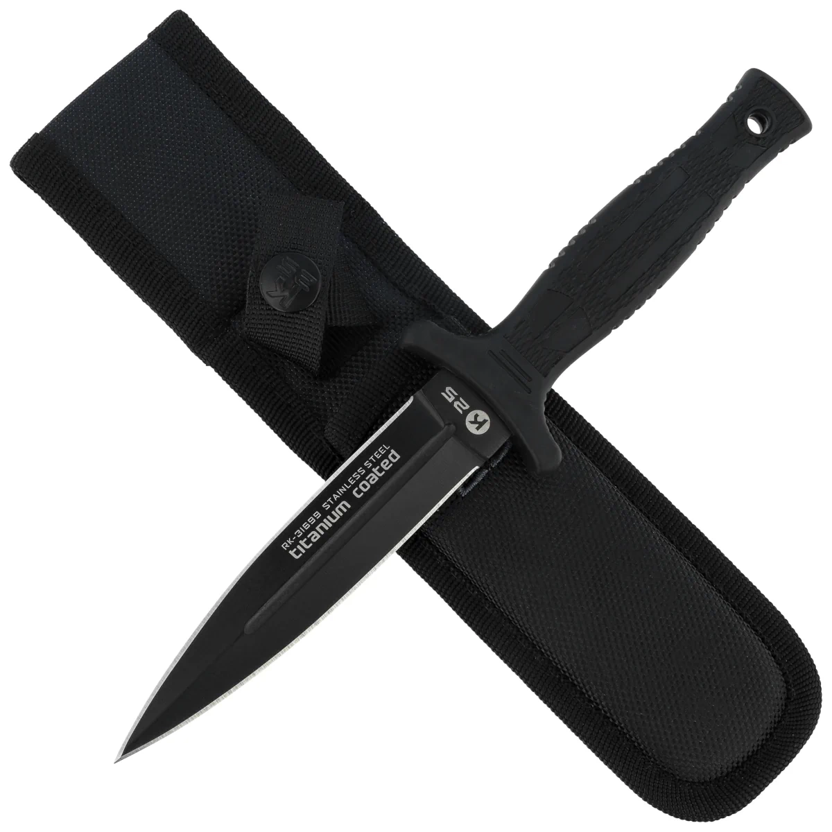 RK-31699 Tactical Black Rubber, Black Titanium is a knife with a design optimized for discreet portability and quick access in emergency situations. The tool's compact form and tactical nature make it a suitable choice for both professionals and civilian users training for self-defense. Blade made of 7Cr17MoV stainless steel, finished with Black Titanium coating, provides increased corrosion resistance, low reflectivity and high durability under heavy use. The dagger profile allows precise knife handling in tight spaces. The overall design is complemented by a textured rubber handle, which provides a secure grip even when wet and under operational stress. Thanks to the included sheath with a clip and MOLLE system, the knife can be worn either by the shoe or on the belt, remaining easily accessible and ready for action. Model 31699 is a functional EDC tool for users who value speed, precision and discretion in their daily equipment.