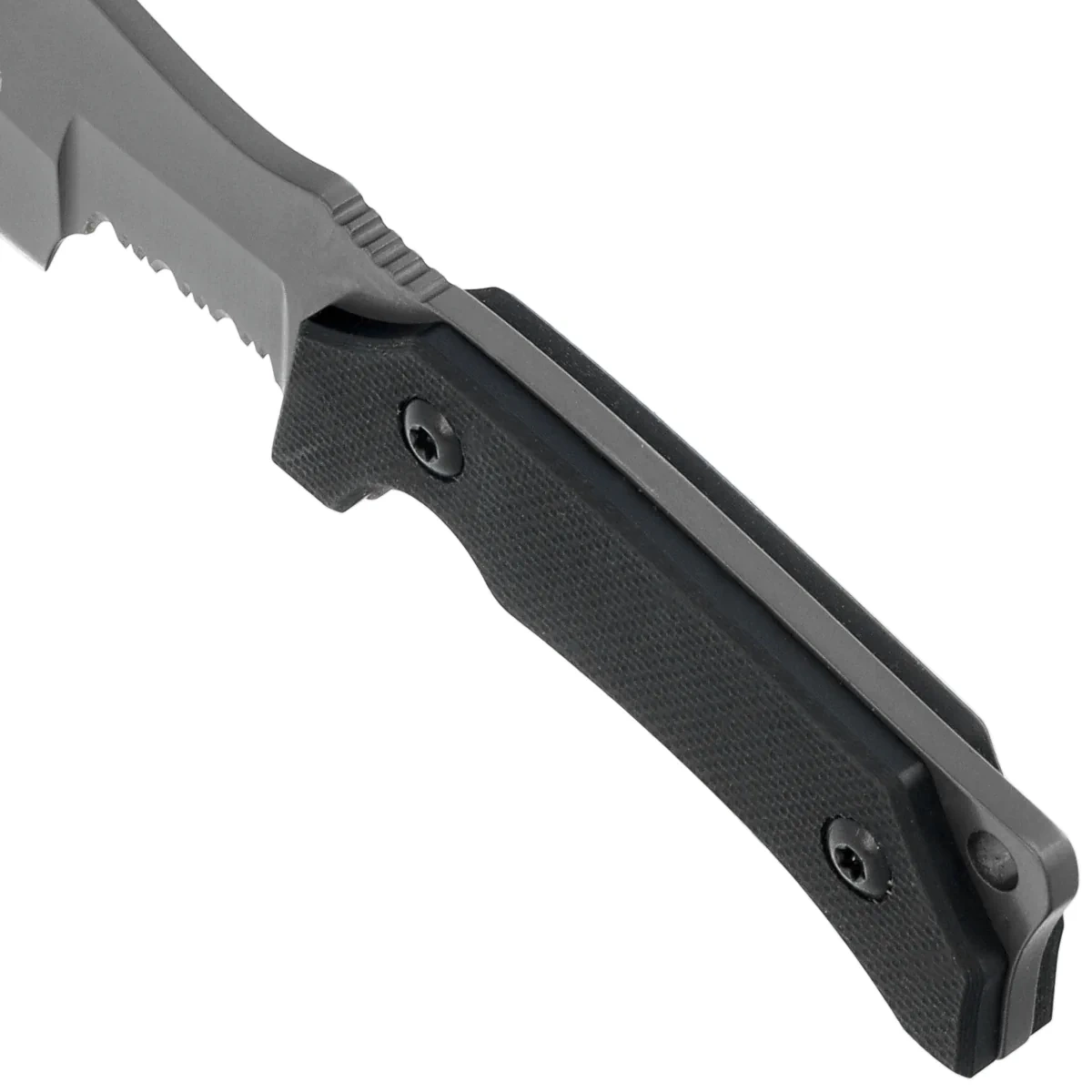 Blade - made of corrosion-resistant 7Cr17MoV steel, offers a long cutting edge thanks to its high belly. This geometry works well for precision field tasks, as well as working in confined spaces. The serrated portion of the Blade helps cut fibrous materials and hard plastics. The use of a titanium-based coating not only improves durability, but also reduces the blade's visibility in confined conditions, enhancing its tactical qualities. Blade design allows for smooth and quick action in emergency and field situations.