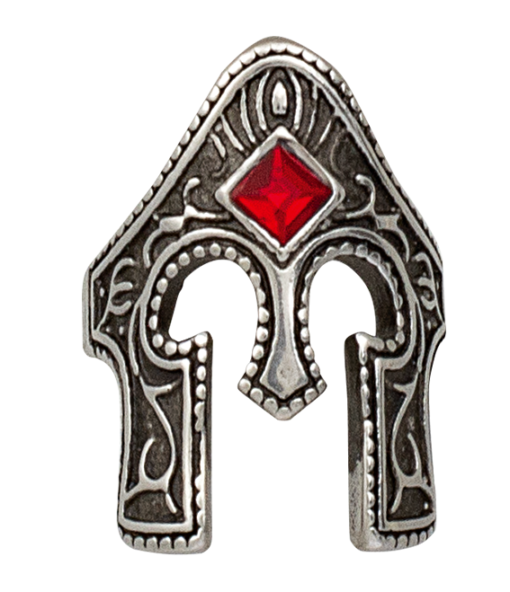 Roman Helmet Ring Ø20 (16204-20) is a massive signet ring inspired by the military heritage of the Roman Empire, the form of which recreates the classic galea helmet worn by legion soldiers and gladiators. The distinctive design with cutouts exposing the face has been enriched with ornamental details and a red diamond-shaped stone, set in the central part of the forehead - an element that gives the composition a ceremonial, almost sacred dimension.