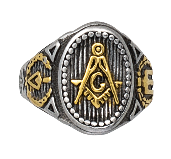 - Masons Ring Ø22 (16200-22) - a symbolic signet ring with the freemasonry emblem (circular, angle, letter “G”) in gold finish against a background of grooved metal. Additional side insignia and antique silver-black finish give it a ritualistic touch.