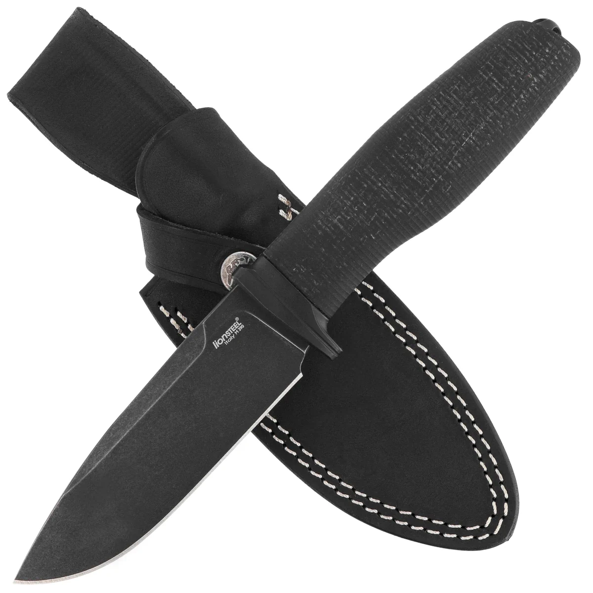• Acha Black Burlap Micarta, Black Stonewashed - a durable LionSteel fixed-head knife designed by Michele “Molletta” Pensato, with a Böhler M390 steel blade and a Burlap Micarta composite handle, reinforced with a titanium crossguard. Leather Sheath.