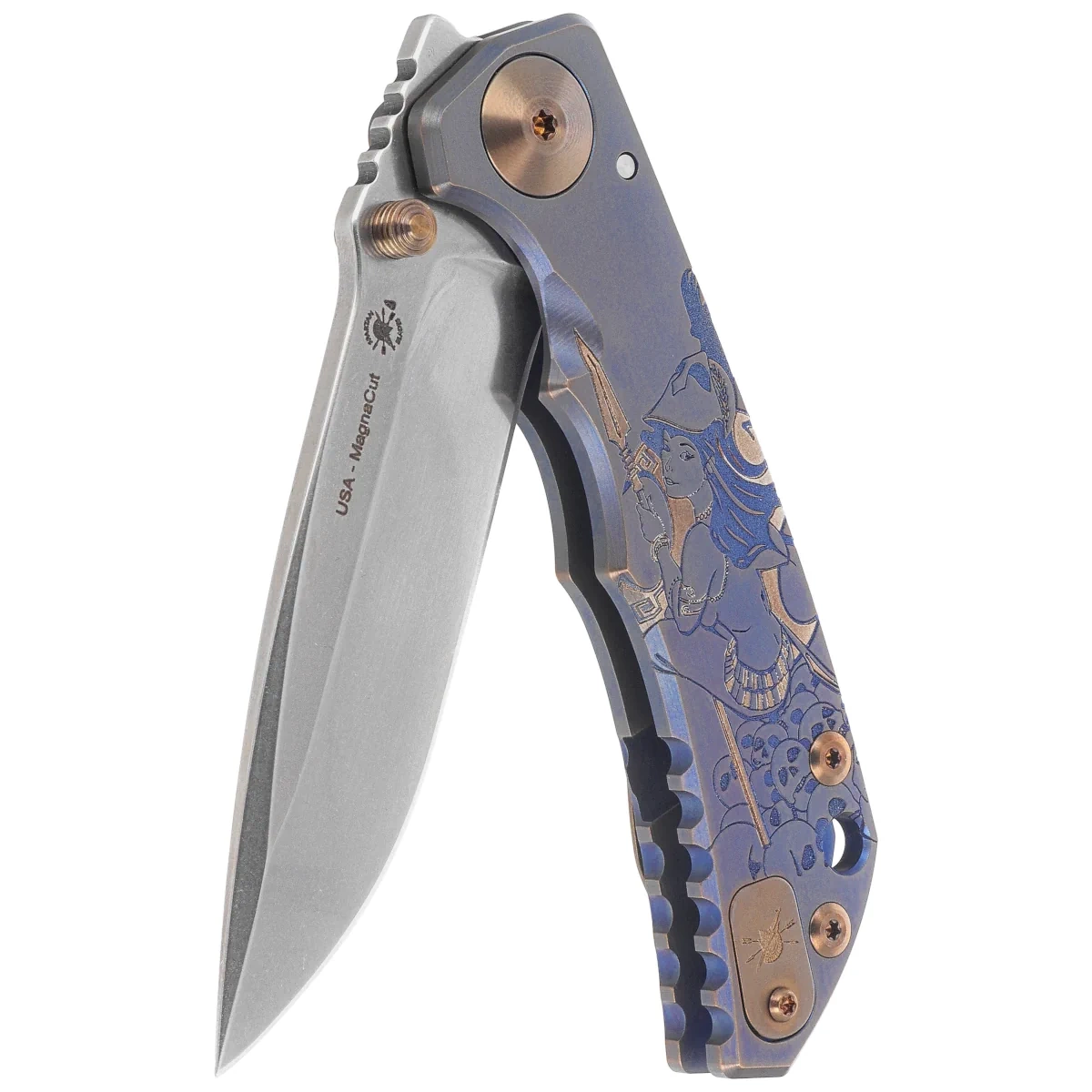 The solid titanium handle is decorated with an artistic engraving, depicting the motif of a young girl. The whole is complemented by bronze anodized details, which contrast strikingly with the blue hue of the Handle. Thanks to the properly contoured handle, the knife sits securely in the hand, ensuring precision when performing a variety of activities. The robust frame lock mechanism guarantees safe use even in extreme conditions. Each piece is handmade in the USA, making it a valuable and sought-after item among both collectors and discerning users.