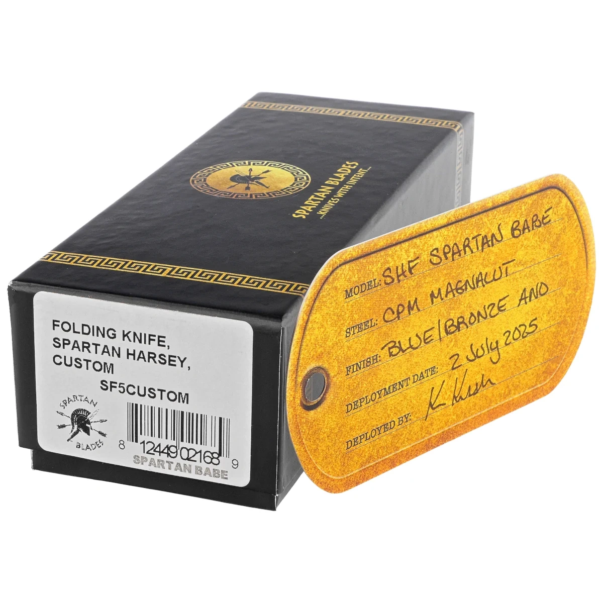 - Spartan Harsey Folder Babe S.E. Blue Titanium, Bronze HW, Satin, limited edition large tactical folder designed by knifemaking legend Bill Harsey. Ergonomic titanium handle decorated with engraving, Blade made of MagnaCut steel.
