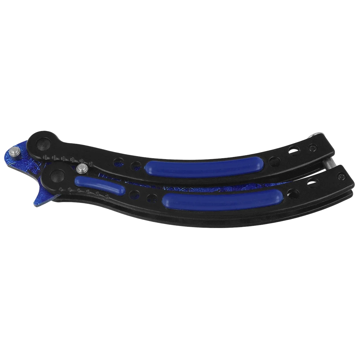 • Balisong Blue ABS/Black Steel, Colorful Blue 3Cr13Mov (02129) - a striking balisong knife with a curved recurved trailing point head in 3Cr13Mov steel and a black steel handle with blue ABS inlays. Ideal for trick-or-treaters and collectors.