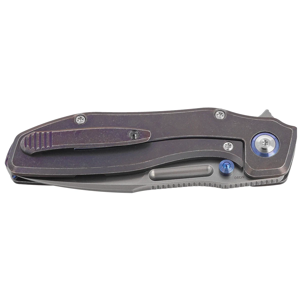 Blade - modified drop point profile with rounded belly and pronounced tip provides excellent cutting precision and durability during heavy use. The blade is made of M390 steel, known for its extreme wear resistance and retention of sharpness for a long time. The compound grind combines a thin working edge with a concave grind at the handle, with a stronger section of a flat grind at the tip. The hand-finish gives the wedge a subtle sheen and perfect geometry. Blade moves on ceramic bearings, guaranteeing exceptional smoothness of opening. Extended milling on the back (jimping) and an ergonomic thumb recess improve control over the blade. The user has three ways of opening - flipper, front flipper and blade cutout.
