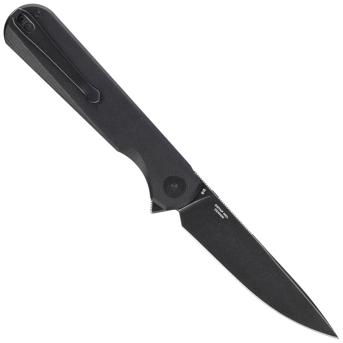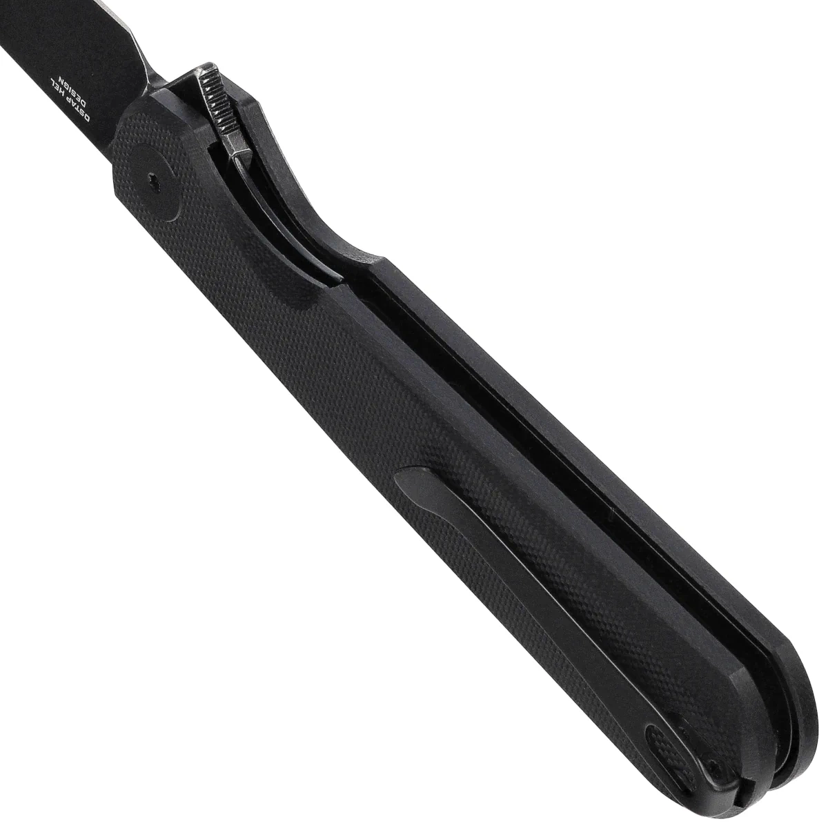 - Flick Black G10, Black Stonewashed, an EDC folding knife designed by Ostap Hel, with a drop point blade in D2 tool steel and a G10 composite handle. Liner lock, styling based on principles of utility geometry.