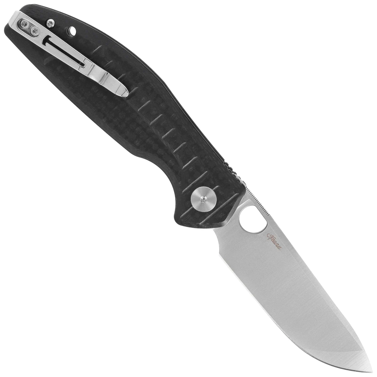 - Angry Owl Black G10 w/ Carbon Fiber Pattern, Satin/Stonewashed - compact EDC knife designed by Keanu Alfaro, with Blade made of D2 tool steel, button lock mechanism and thumb hole for opening. Distinctive handle made of durable G10 composite.
