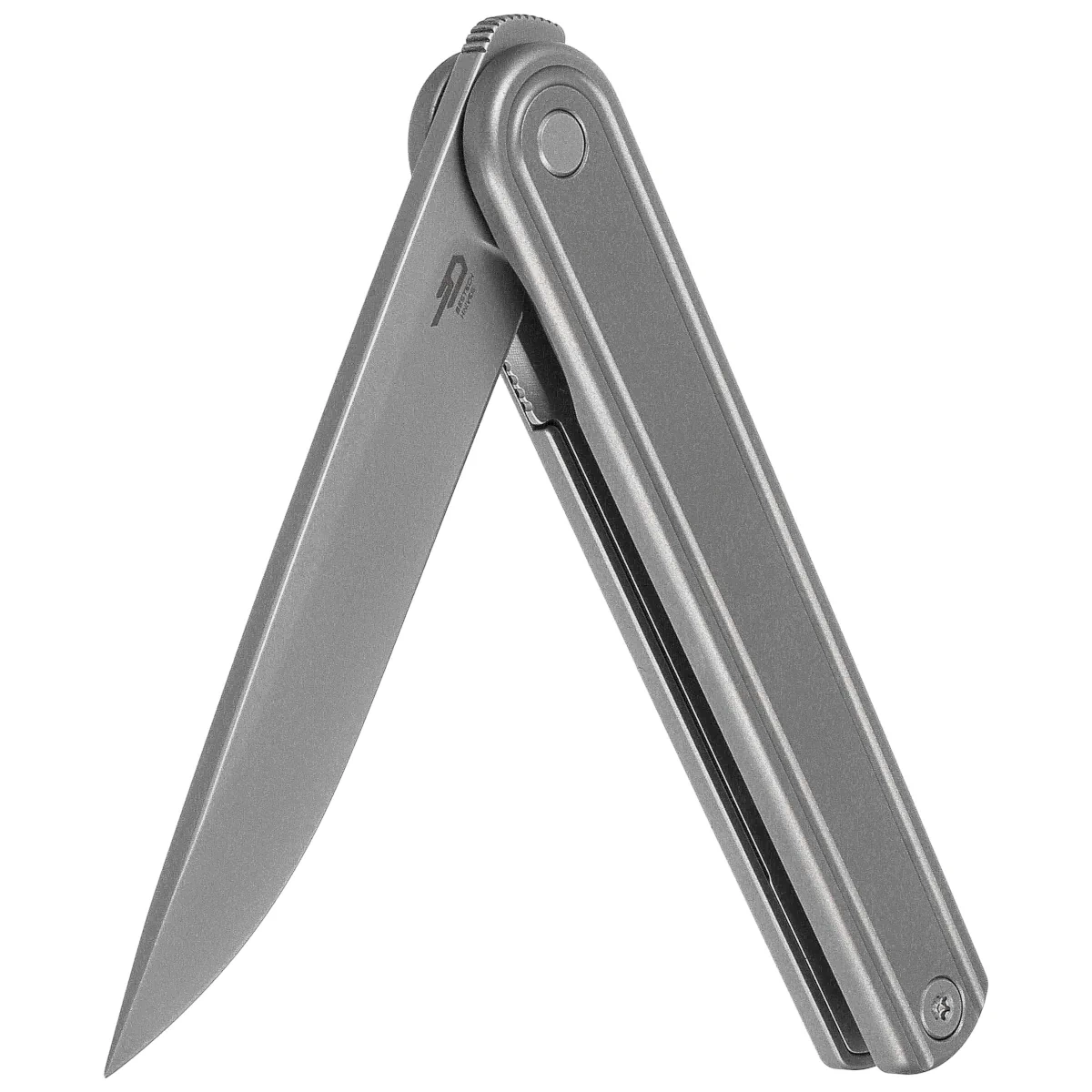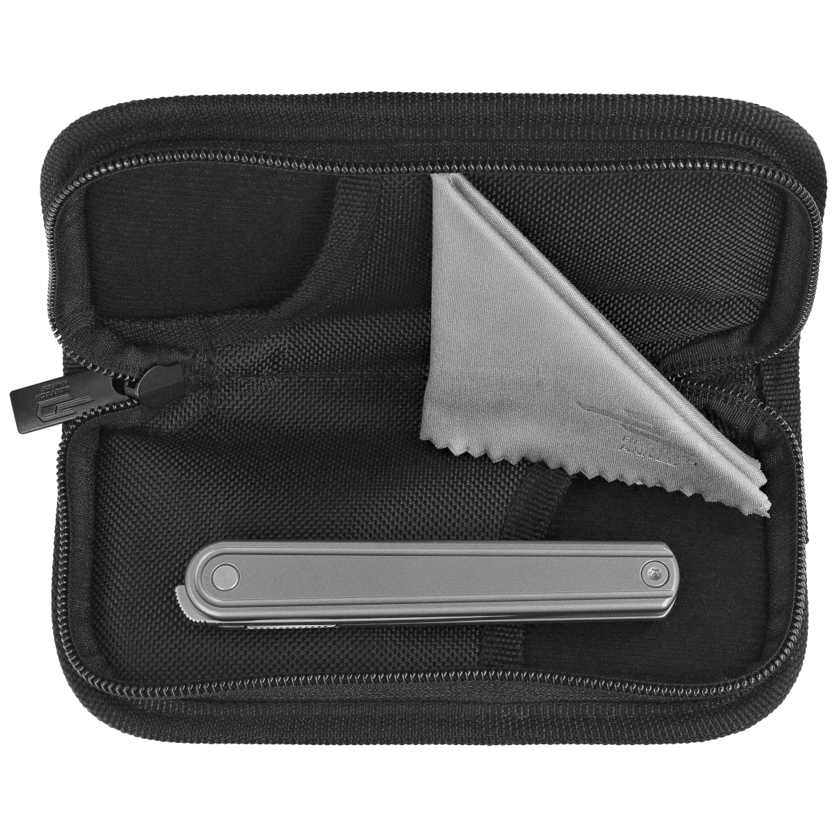 Handle - made of sandblasted titanium provides structural rigidity and durability while maintaining very low weight. Smoothly routed lines and CNC milling improve the ergonomics of the grip, and the integrated deep carry clip allows for convenient and discreet carrying. Hidden screws and precise fit of the components emphasize the modern, minimalist character of the model. The interior has been further relieved by internal milling, which reduces the weight of the structure without compromising its rigidity. The overall design has been refined for everyday reliability and elegant aesthetics.