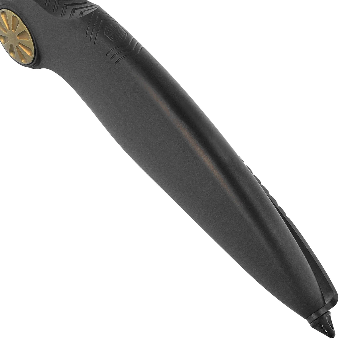 Handle - a monolithic lump of titanium 6AL4V, precisely milled, also coated with DLC, which gives it a sleek, industrial character. The integrated deep carry clip in a design that corresponds to the dorsal milling allows deep and discreet carry. The frame lock mechanism used is equipped with a steel inlay, which increases its durability. At the end of the Handle there is a functional glass striker, ideal in emergency situations. The Handle has been contoured for a stable grip, ensuring safety and comfort.