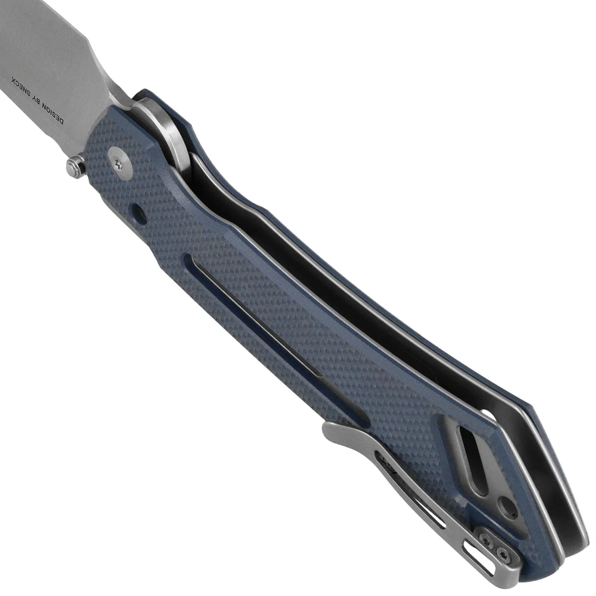 Buster FG Neutral Blue G10, Satin was created in collaboration with renowned designer Snecx Tan, whose approach to design is based on the principle of “form follows function.” The result is a design with a definite geometric character that stands out both visually and in terms of use. This premium folder is a tool for the discerning - designed for everyday use, but with an aesthetic that will also please collectors. Blade is made of Nitro-V steel, known for its high resistance to corrosion and maintenance of working sharpness. It uses a modified wharncliffe profile with a clearly defined cutting edge and a gently dropped tip - ideal for precision cuts and controlled movements. The satin finish gives the Blade a distinct, modern look. The Handle is made of textured G10 composite, which provides excellent grip even in harsh conditions. Liners and spacers add elegance, while ergonomic cutouts allow precise handling - even with gloves. The whole is complemented by a deep-carry clip, a lanyard hole and a Superlock locking mechanism for safety and wear resistance. This is a full-fledged EDC knife for users who value reliability, style and advanced engineering.
