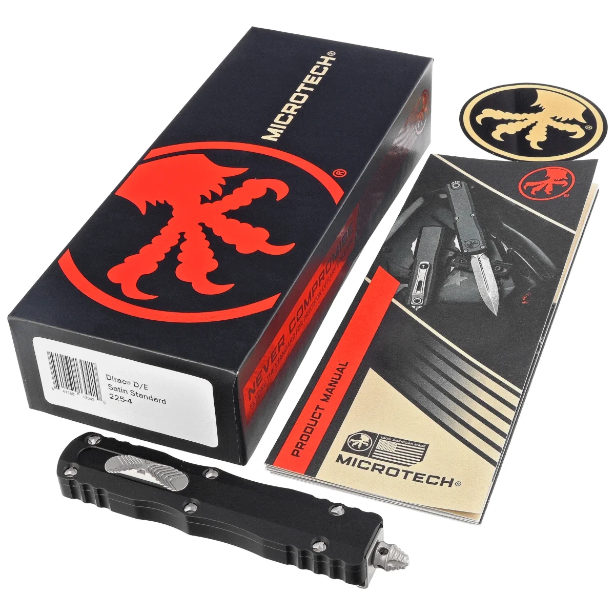 - Dirac D/E Black Aluminum, Satin is a compact OTF automatic knife from the Dirac series. Operating in D/A mode, it features a hell of a fast blade extension mechanism. Slider button on the side of the handle. Designed by Tony Marfione of Microtech Knives