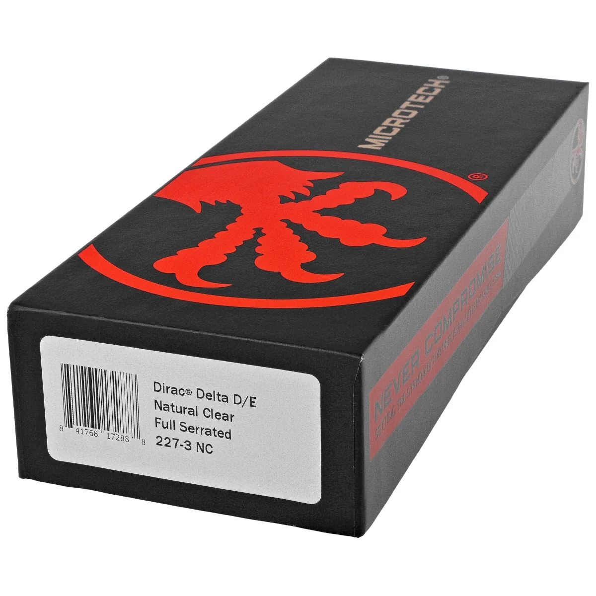 • Dirac Delta D/E Natural Clear Aluminum, Black F/S larger version of the Dirac series OTF automatic knife. Operating in D/A mode, it features a fast blade extension mechanism. Slider button on the side of the handle. Designed by Tony Marfione, Microtech.