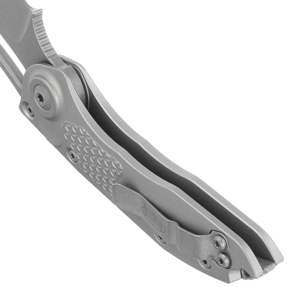 Handle - made on CNC milling machines with excellent precision, from 6061-T6 Aluminum with deeply milled Tri-Grip structure. The knife's wide opening button has been recessed to prevent accidental opening. Both grips have been bolted together using a solid aluminum backspacer. A double-sided (right/left) clip allows the knife to be carried discreetly in the tip-up position. The protruding part of the backspacer in which there is a hole for a rope, can also serve as an improvised glass breaker.