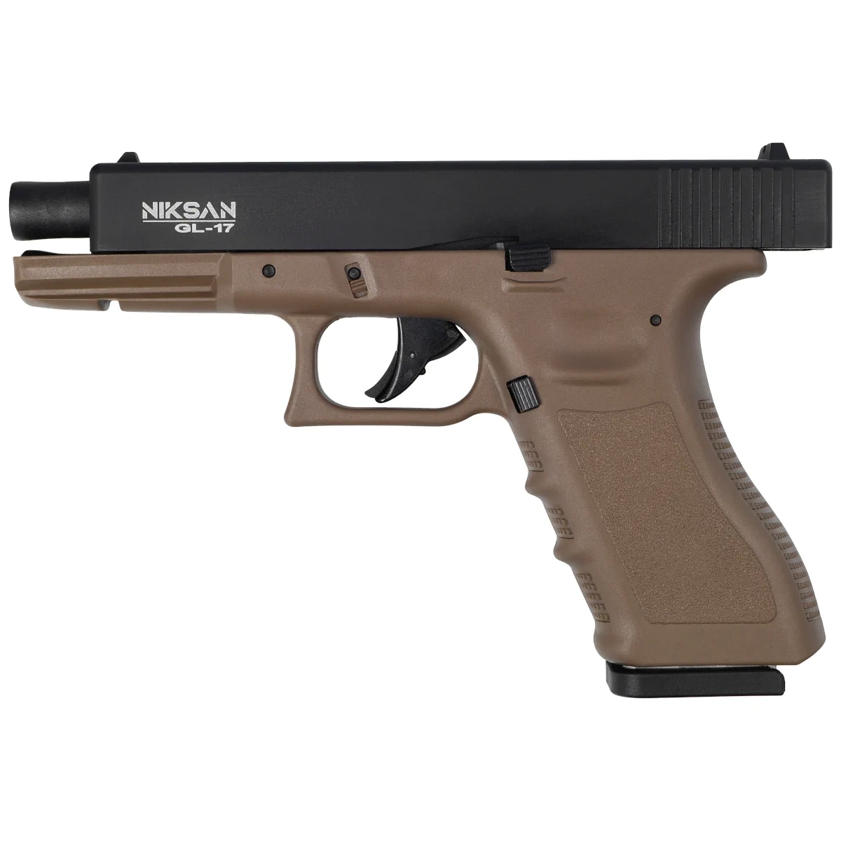 - Niksan Defense NKS GL17, CO2-powered BB air pistol, a faithful replica of the Glock 17. This model features a metal slide with a blowback system that realistically simulates the operation of a real firearm. Tan finish.