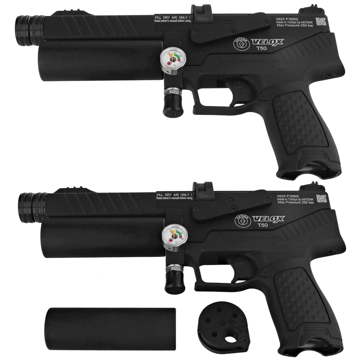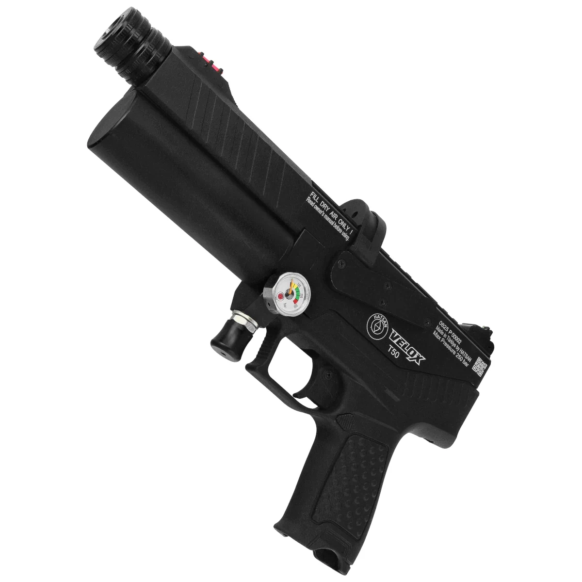 Powered - by compressed air from an aluminium pressure air tank located under the barrel with a capacity of 55 cc, filled to 250 bar. A fully charged air cylinder provides about 20 effective shots. The Velox T50 pistol's air cylinder unscrews, allowing for quick replacement of an empty tank with a full one and continued shooting. The set includes two replaceable air tanks. A pressure gauge allows for ongoing monitoring of the tank pressure and its charge level.