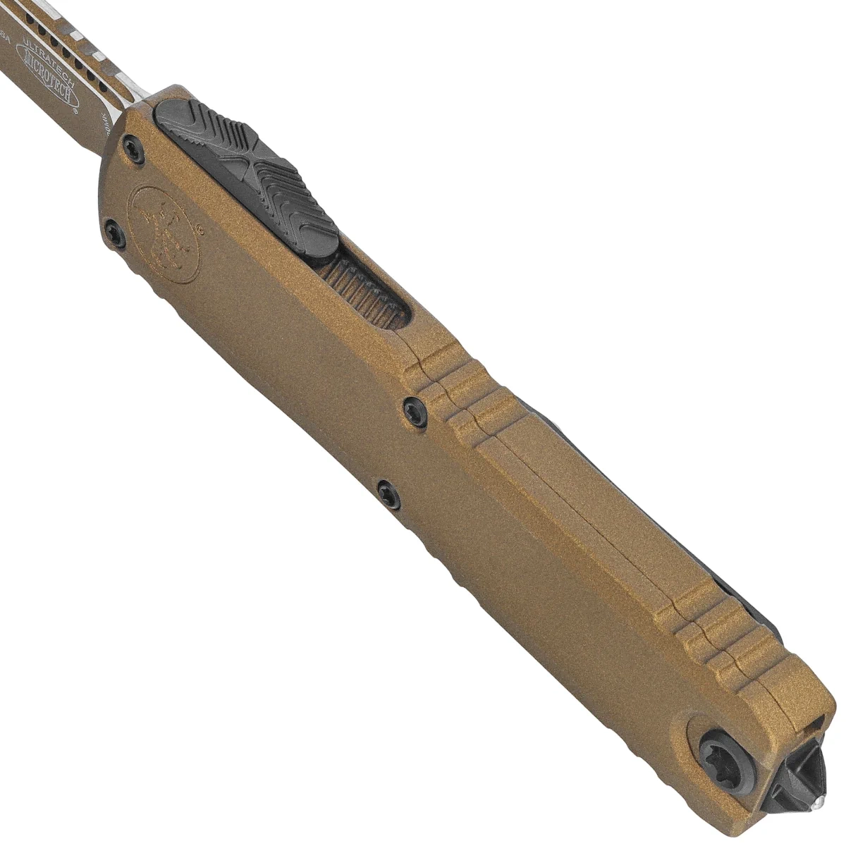 Ultratech S/E Gen III ZBP Burnt Bronze Cerakote Aluminum, Burnt Bronze Cerakote is a new addition to the Ultratech series - Microtech's first OTF knife without any blade play when unfolded! The blade play free automatic is distinguished by a number of improvements such as; Crud Kutter™, Dual-Fuel Drive Train™, Zero Blade Play™. The Handle was also redesigned, equipping it with solutions known from other models. Working in D/A (Double Action) mode, it allows the blade to be instantly extended and retracted with a single thumb movement. The design by Tony Marfione, owner of Microtech Knives, combines modern design with the highest quality workmanship