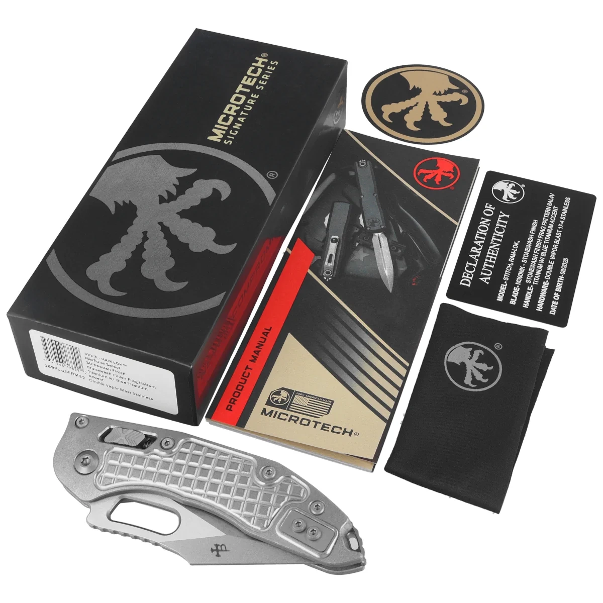 • Stitch Ram-Lok S/E Frag Titanium, Stonewashed manual version of the popular design by Sebastijan Berenjie of Borka Blades and Microtech. Wide harpoon-shaped blade, superior materials and legendary quality workmanship from Microtech Knives