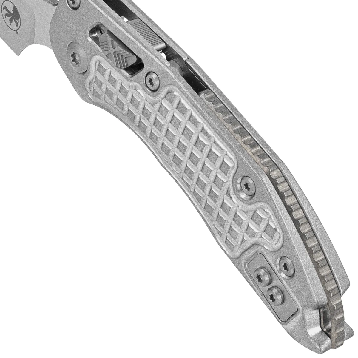 Handle - made with the utmost precision in 3D technology on CNC milling machines from durable titanium, finished with stonewashed method , which gives it an elegant matte look and resistance to minor scratches. For a better grip, the surface of the Handle has been covered with a distinctive texture imitating the surface of a fragmentation grenade(Frag Pattern). A wide locking slide with Microtech's characteristic stepped structure(X Button) provides secure and comfortable operation. The two grips are connected by a solid titanium backspacer stained bronze, which increases the rigidity of the construction. A double-sided (right/left) clip allows the knife to be carried discreetly in tip-up position. A protruding section of the backspacer with a rope hole can also serve as an improvised glass breaker. Hardware (screws, pivot, slider) finished with Double Vapor Blast.