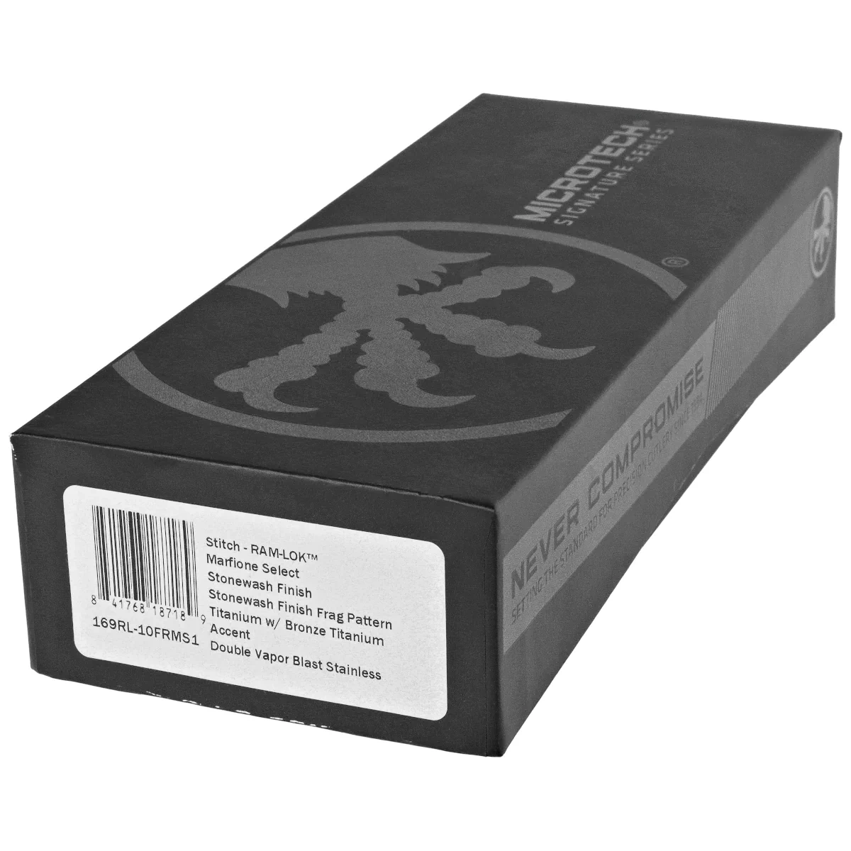 - Stitch Ram-Lok S/E Frag Titanium, Double Vapor Blast HW, Stonewashed manual version of the knife from Bork Blades and Microtech. M390MK steel blade, titanium Handle, bronze titanium backspacer. Elite Marfione Select Signature Series