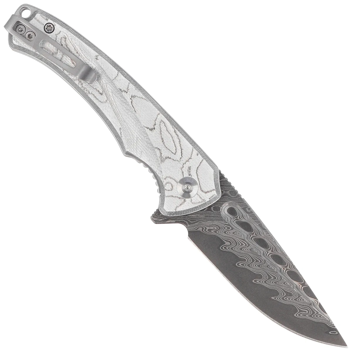 Voidflare G10 w/ Aluminum Foil, Damascus is an excellent example of a modern approach to everyday knife design - it combines practical functionality, smooth mechanics and elegance of materials. It features a dynamic, elongated silhouette and a subtle combination of textures, making it an excellent choice for both everyday carry and collectible use. Blade is made of stainless damast, known for its excellent corrosion resistance and ability to maintain sharpness for long periods of time. Thanks to its drop point profile and hollow grind, the blade not only maintains functionality and durability, but also gains a deep, tactical character. Opening the knife with the flipper is instant thanks to the use of ceramic bearings, which guarantee a noiseless, precise blade action. Handle is made of durable G10 composite, whose texture provides great grip in all conditions. The slim, ergonomic profile with delicate cutouts adapts naturally to the shape of the hand, while the finish accents add distinction and prestige to the overall design. The interior of the Handle is reinforced with steel liners, which increase the rigidity of the structure and ensure stability during intensive work. The applied liner lock works intuitively and safely, effectively securing the blade in the open position. The model is equipped with a deep carry clip for discreetly carrying the knife, and a lanyard hole, allowing you to attach a safety line or key ring. Voidflare is for users who expect from their EDC not only a tool, but also a sophisticated accessory - lightweight, modern and technically refined.