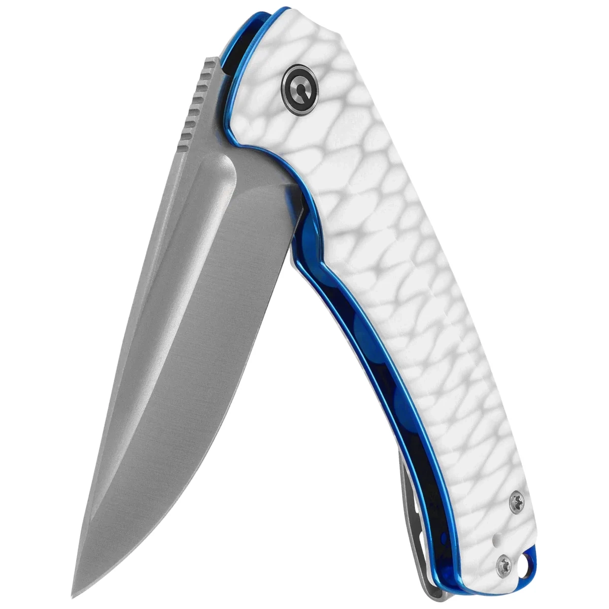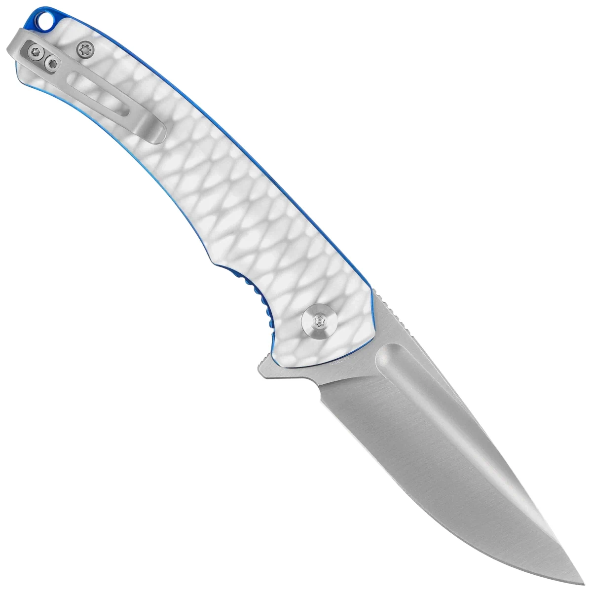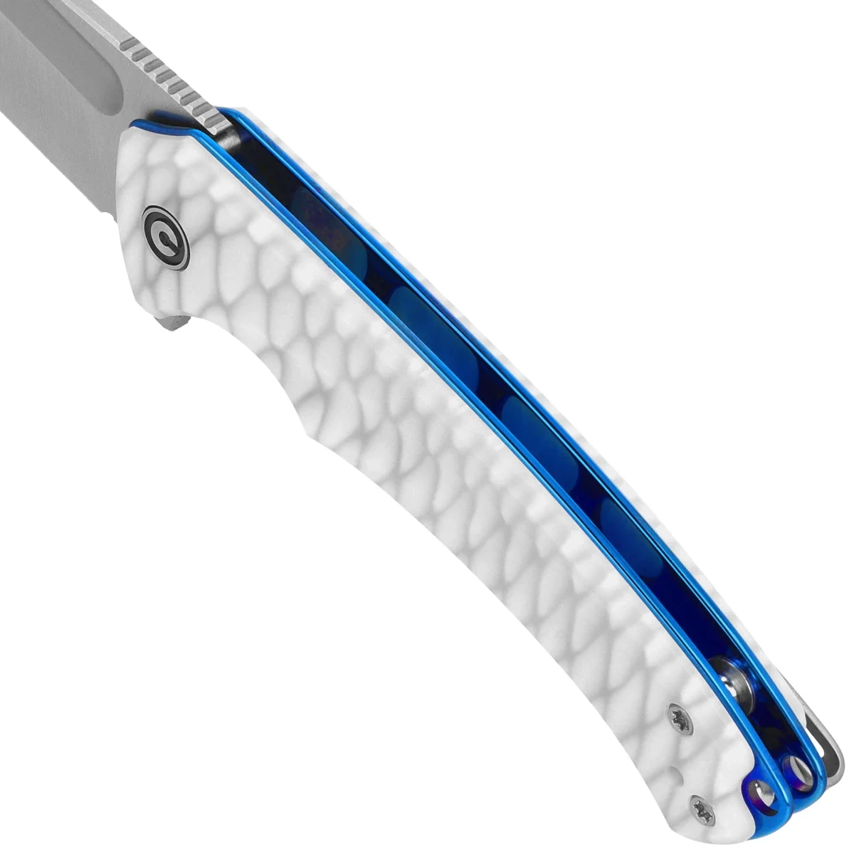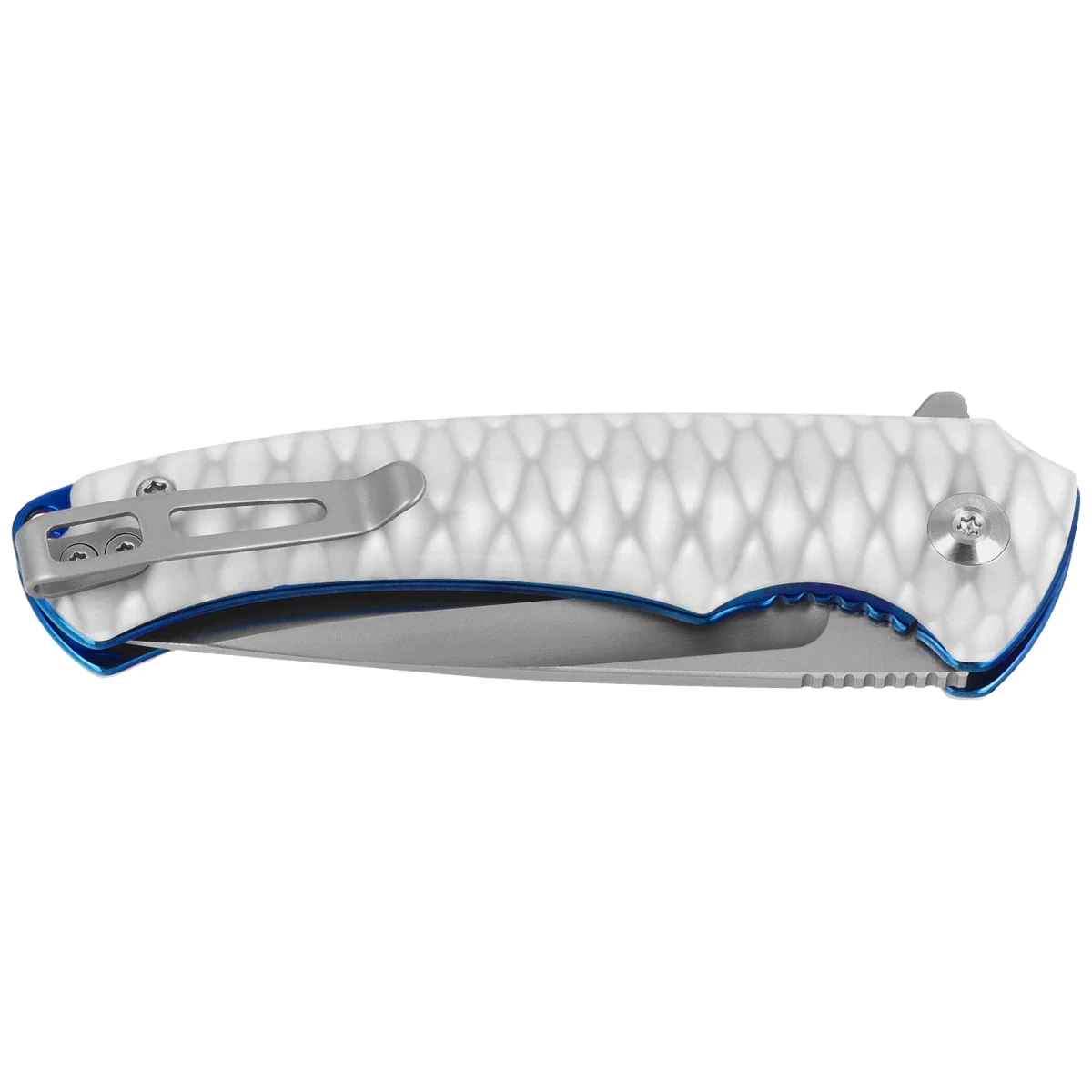 Handle - made of white-gray resin is characterized by excellent mechanical strength and light weight. Its texture improves grip, and the ergonomic profile with cutouts facilitates precise control of the knife in any hand position. Internal steel liners increase the rigidity of the design, and the liner lock ensures safety and reliability in everyday use. Also noteworthy are the reptile shell-like finish details, which enhance the aesthetics of the model, giving it a subtle, collectible touch. A deep-carry clip allows for low-profile carry, while a lanyard hole enhances functionality in off-road conditions. The whole creates a perfectly balanced EDC tool with exceptional aesthetics.