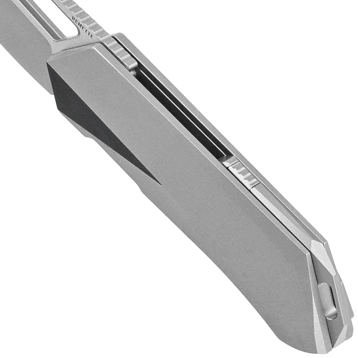 Handle - Skeleton made of titanium 6AL4V, on which, without the use of screws, titanium grips are mounted, precisely milled from a single piece of material using CNC machine tools. This innovative design ensures exceptional robustness and mechanical resistance. A single-position titanium deep-carry clip (right side) allows the knife to be carried discreetly in the pocket in tip-up position (blade tip up). There is a hole in the back of the Handle for threading a safety cable.