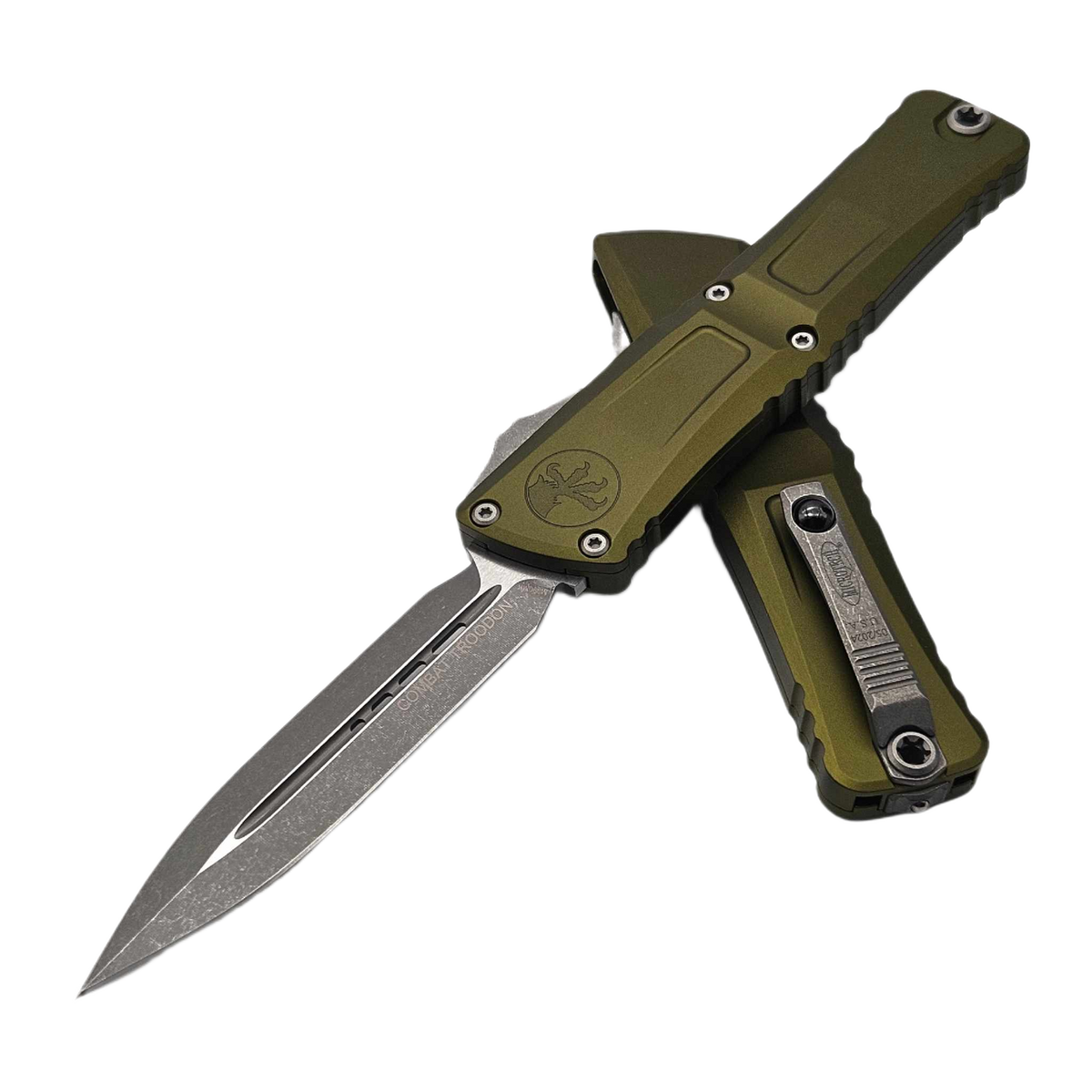 Combat Troodon Gen III D/E OD Green Aluminum, Apocalyptic this largest of the automatic knives is the pinnacle of precision engineering and tactical prowess in the field of OTF (Out The Front) knives. Built for a wide range of utility applications, it boasts a 25% larger size compared to the flagship Troodon. Precisely crafted, it features a sophisticated and hellishly fast mechanism that extends the razor-sharp blade. 100% made and assembled in the USA. Designed by Anthony Marfione, knifemaker and owner of Microtech Knives.