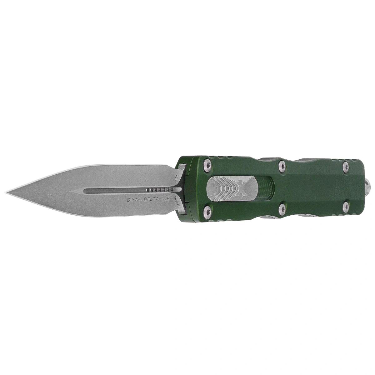 - Dirac Delta D/E Emerald Green Aluminium, Apocalyptic Larger version of the OTF automatic knife from the Dirac series. D/A mode, equipped with a fast blade ejection mechanism. Slider button on the side of the handle. Designed by Tony Marfione.