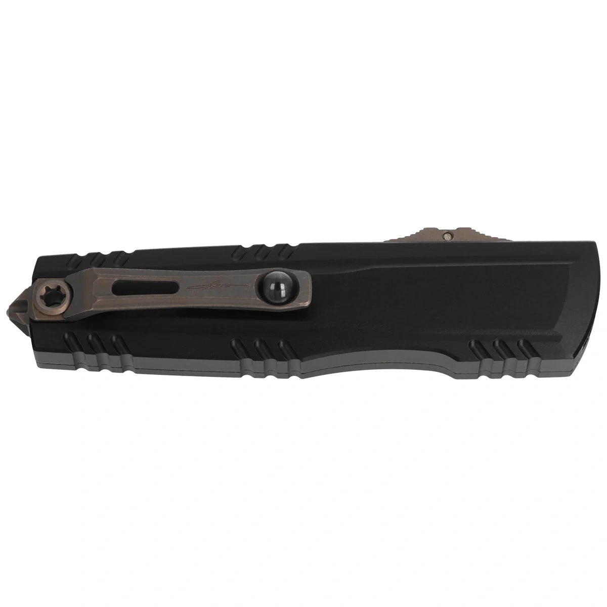 Handle - made with excellent precision in 3D technology on CNC milling machines, from Mil-Spec hard-coated aluminum 6061-T6. On the Handle deeply engraved Microtech logo, the claw of a bird of prey. The surface texture of the Handle makes the knife non-slip in the hand during use. There are notches (jimping) on the back and bottom of the handle for a more secure grip. Innovative boltless handle design. The slim profile and milled two-position (right/left) solid titanium deep-carry clip allow the knife to be carried discreetly in a pocket, in tip-down (blade tip down) position. Equipped with a smooth rollerball, which allows the knife to slide easily into the pocket without damaging the edges of the pocket. The Handle is finished with a new version of glass breaker, a steel pyramid, into which a tungsten carbide ball has been pressed. On the back of the Handle there is a hole for interweaving a decorative cord.