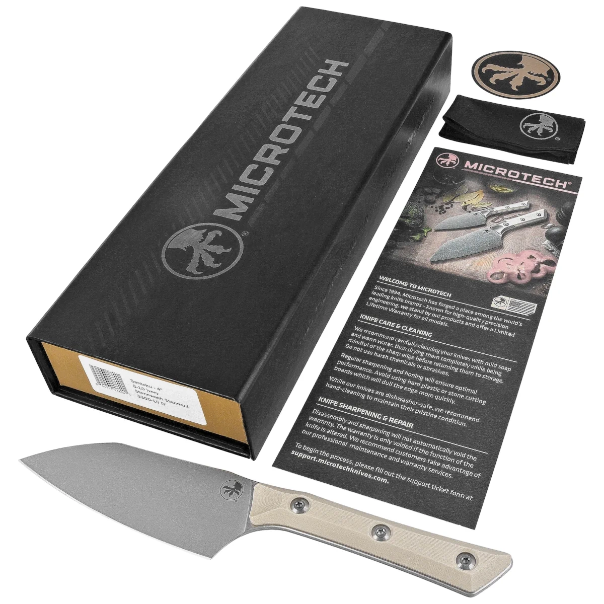 Santoku 4.2" Ivory G10, Stonewashed is a modern interpretation of the traditional kitchen knife by one of America's most respected knife brands. Created in the spirit of technical perfection and utilitarian minimalism, it is the perfect tool for professional chefs and enthusiasts of precision cutting. The distinctive santoku silhouette is enhanced here with high-end materials and ergonomics refined to perfection. Blade made of advanced M390MK steel offers excellent sharpness retention, full corrosion resistance and microstructure stability, even under heavy use. Its stonewashed finish gives the surface a matte texture that effectively masks traces of use and adds a professional, working character to the blade . With its santoku profile, the knife successfully performs the tasks of portioning, slicing and chopping, while maintaining smooth operation and precise blade guidance. The handle is made of durable G10 composite, a material resistant to moisture, temperature and mechanical factors. Subtle milling improves the grip, and the minimalist geometry of the handle provides stable support for the hand - regardless of the intensity of work. Mounting elements in the form of torx screws increase the rigidity of the design and allow easy disassembly for maintenance. Thanks to the perfectly balanced combination of ergonomics, durability and modern design, the Santoku model from Microtech is perfect both in the professional kitchen and in the hands of the home user who does not consider compromising on quality. The included protective blade guard allows for safe storage and transportation. This is a knife that not only meets expectations - he redefines them.